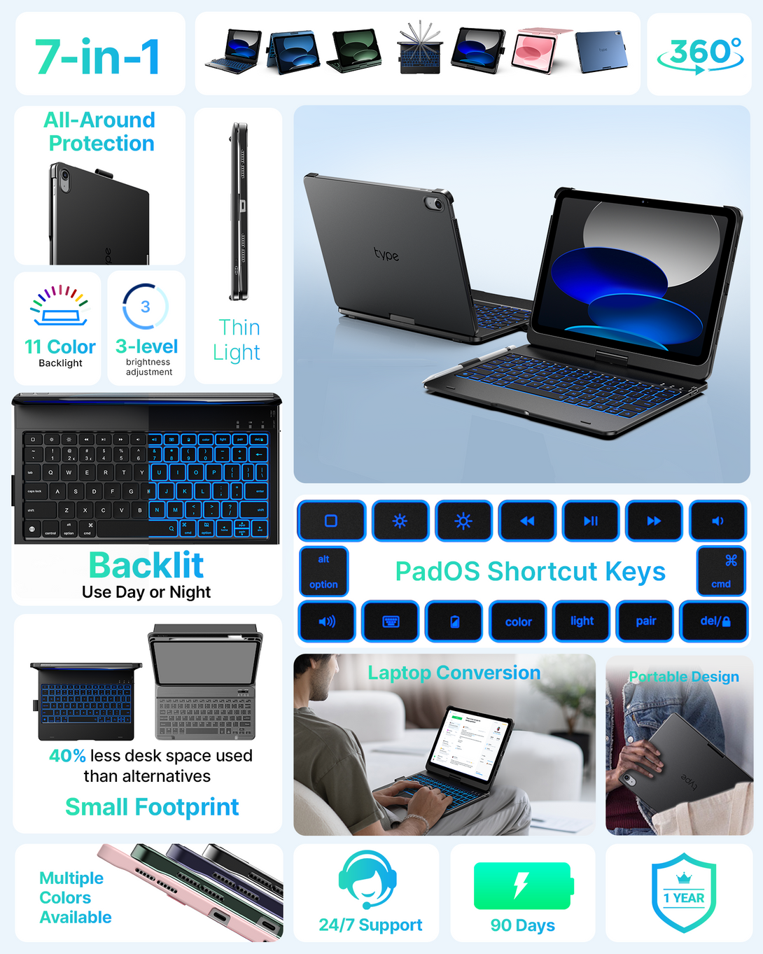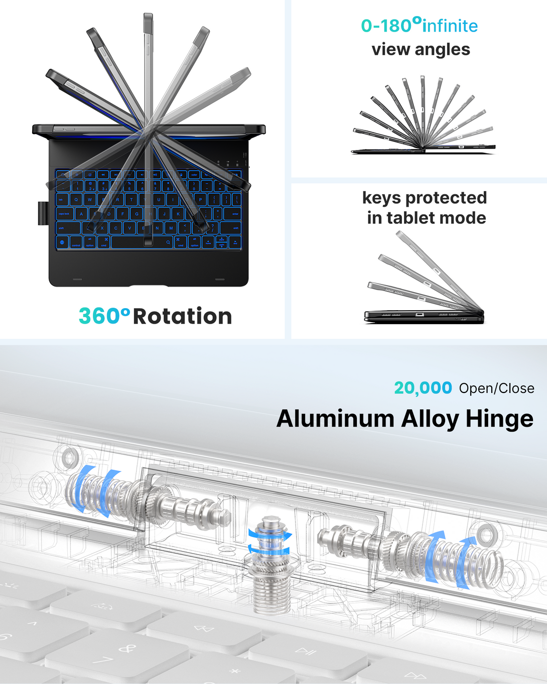 7 Use Modes: The patented 360° hinge, stress-tested for 20,000 cycles, adapts to any task. Whether typing, viewing, or using your iPad in tablet mode, enjoy the flexibility and convenience for every scenario.