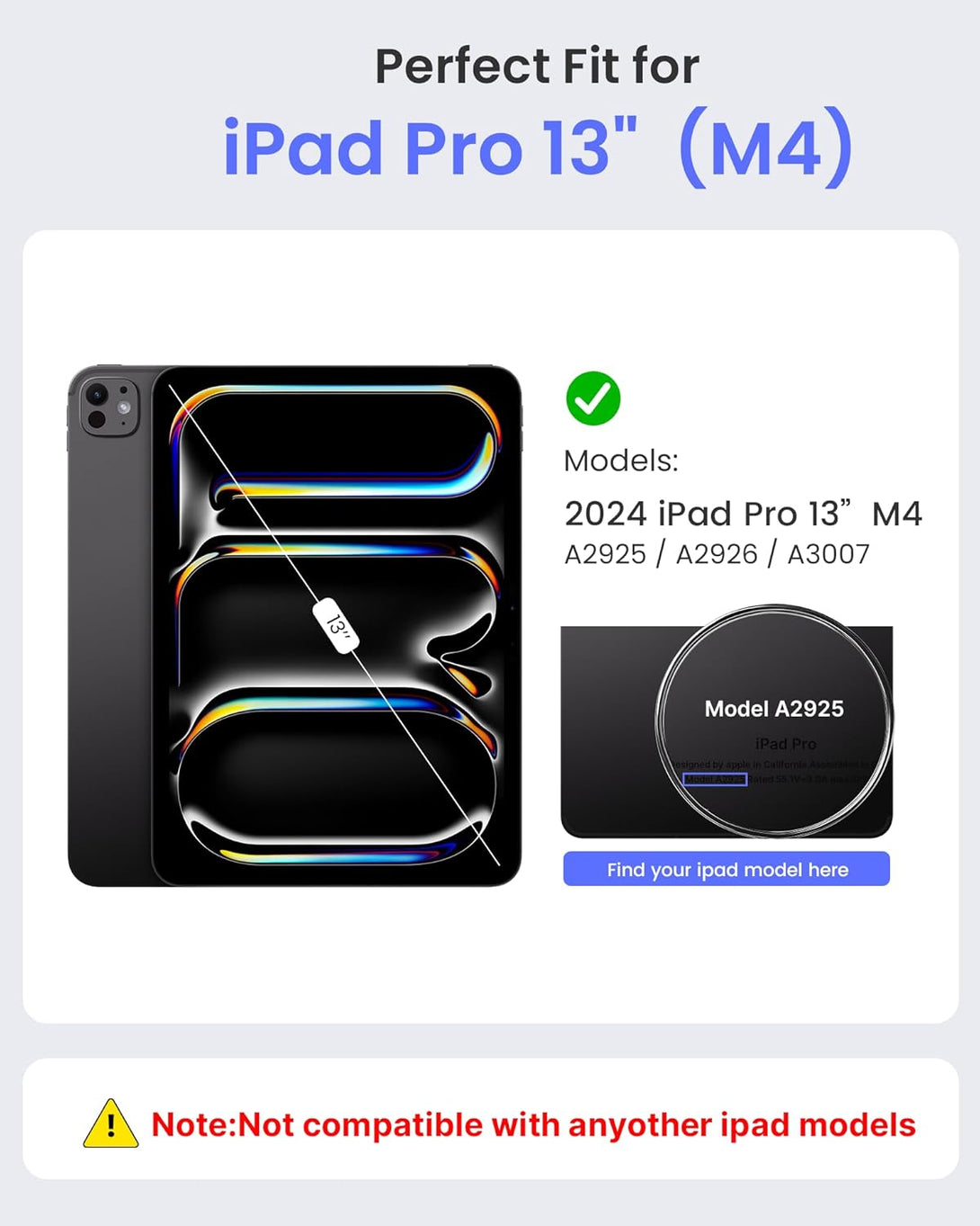 𝗖𝗼𝗺𝗽𝗮𝘁𝗶𝗯𝗶𝗹𝗶𝘁𝘆:Elevate your iPad Pro 13 inch (M4) 2024 experience with our versatile keyboard case. Models include A2925,A2926,A3007. Due to the different arrangement of the magnets, this magic keyboard case is not compatible with other iPad models.If you're unsure about compatibility, feel free to reach out—we're happy to help!