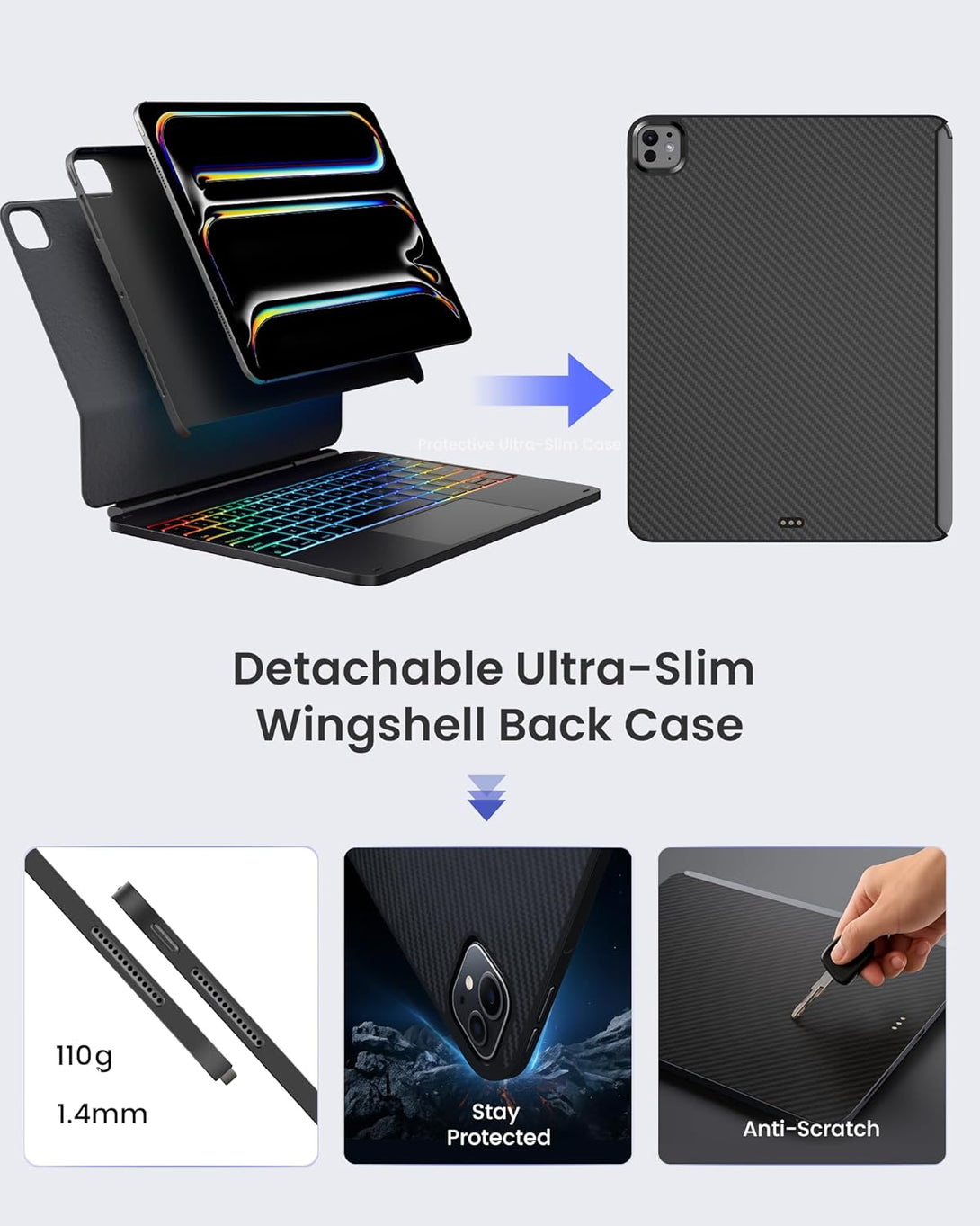 𝗦𝗹𝗶𝗺 & 𝗦𝗹𝗲𝗲𝗸 𝗗𝗲𝘁𝗮𝗰𝗵𝗮𝗯𝗹𝗲 𝗖𝗮𝘀𝗲: The detachable case is only 1.4mm thin and weighs just 110g, offering extra support and lasting protection while keeping your device lightweight and portable. Providing a strong 3.4kgf magnetic force to ensure a stable and secure connection, preventing your device from slipping or accidentally falling.