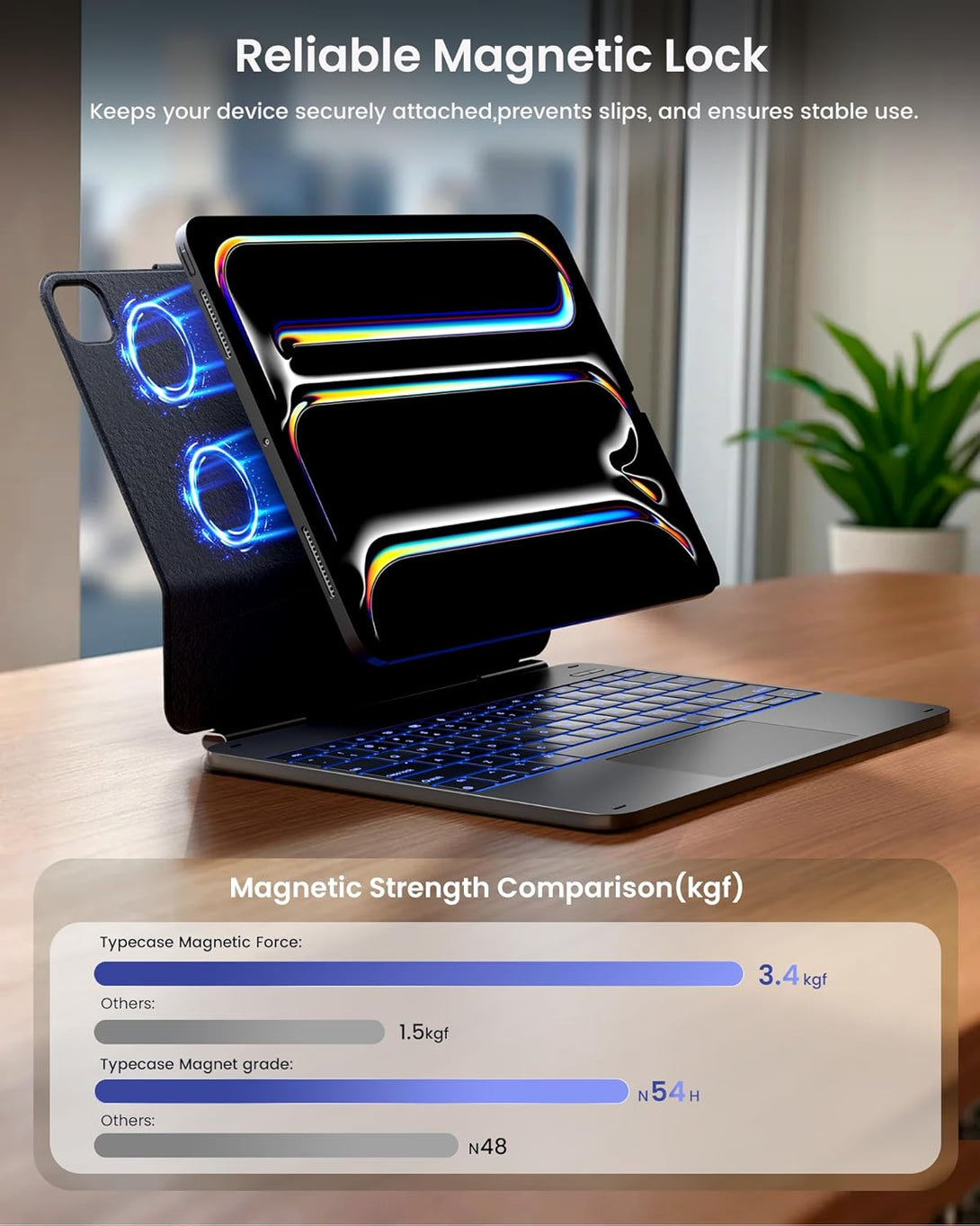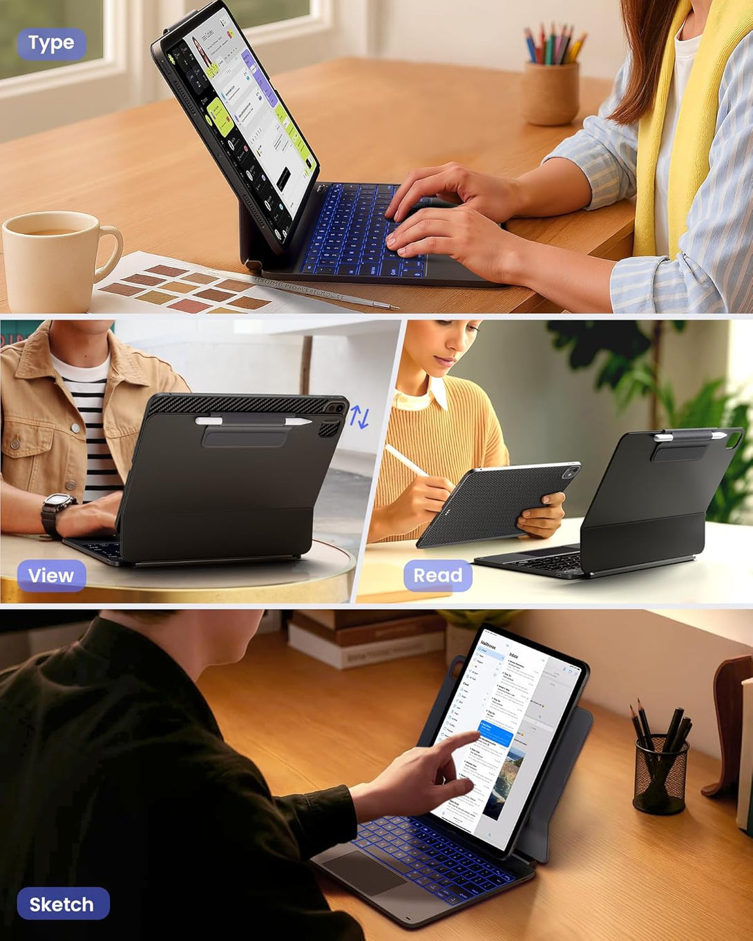 𝗖𝗼𝗺𝗳𝗼𝗿𝘁𝗮𝗯𝗹𝗲 𝗧𝘆𝗽𝗶𝗻𝗴: The keyboard features well-spaced, responsive keys with 11 backlight options, 3 adjustable brightness levels, and iPadOS shortcuts. Additionally, the ergonomic design ensures comfortable typing for extended periods, boosting work efficiency and typing speed.