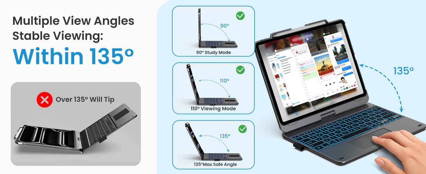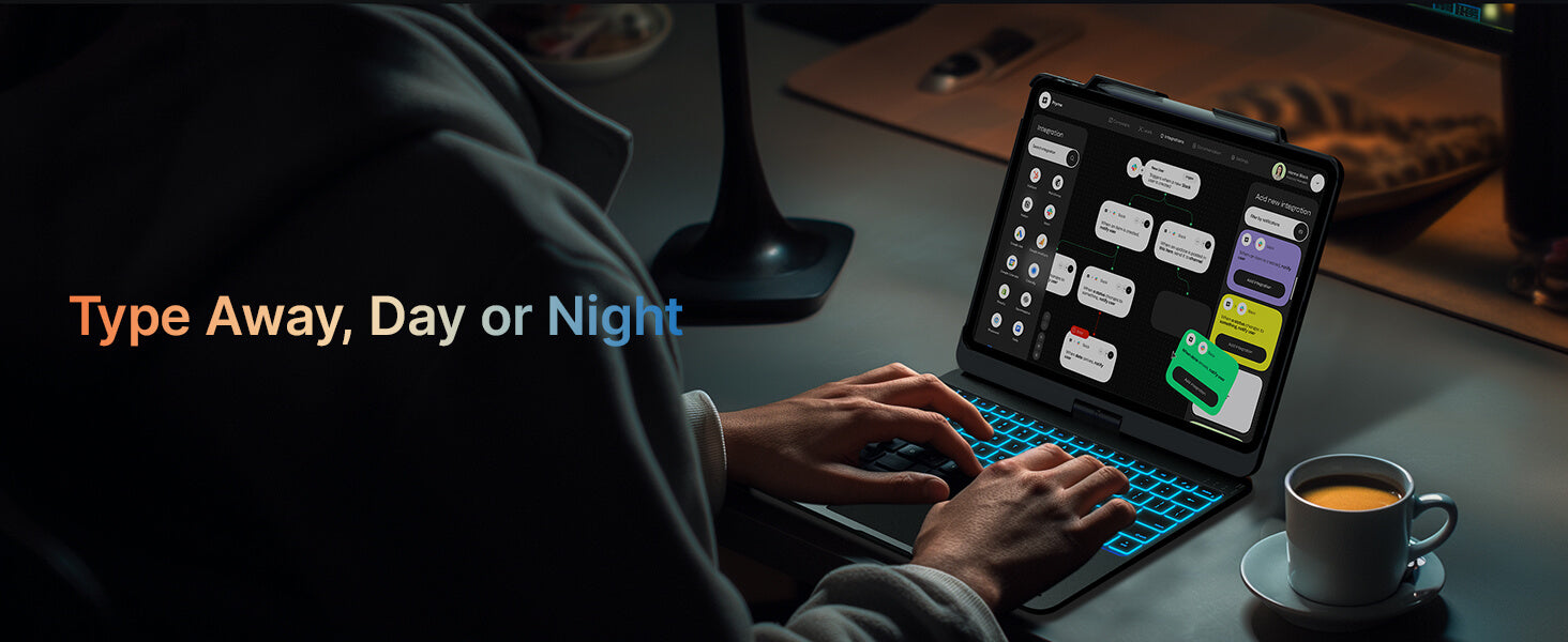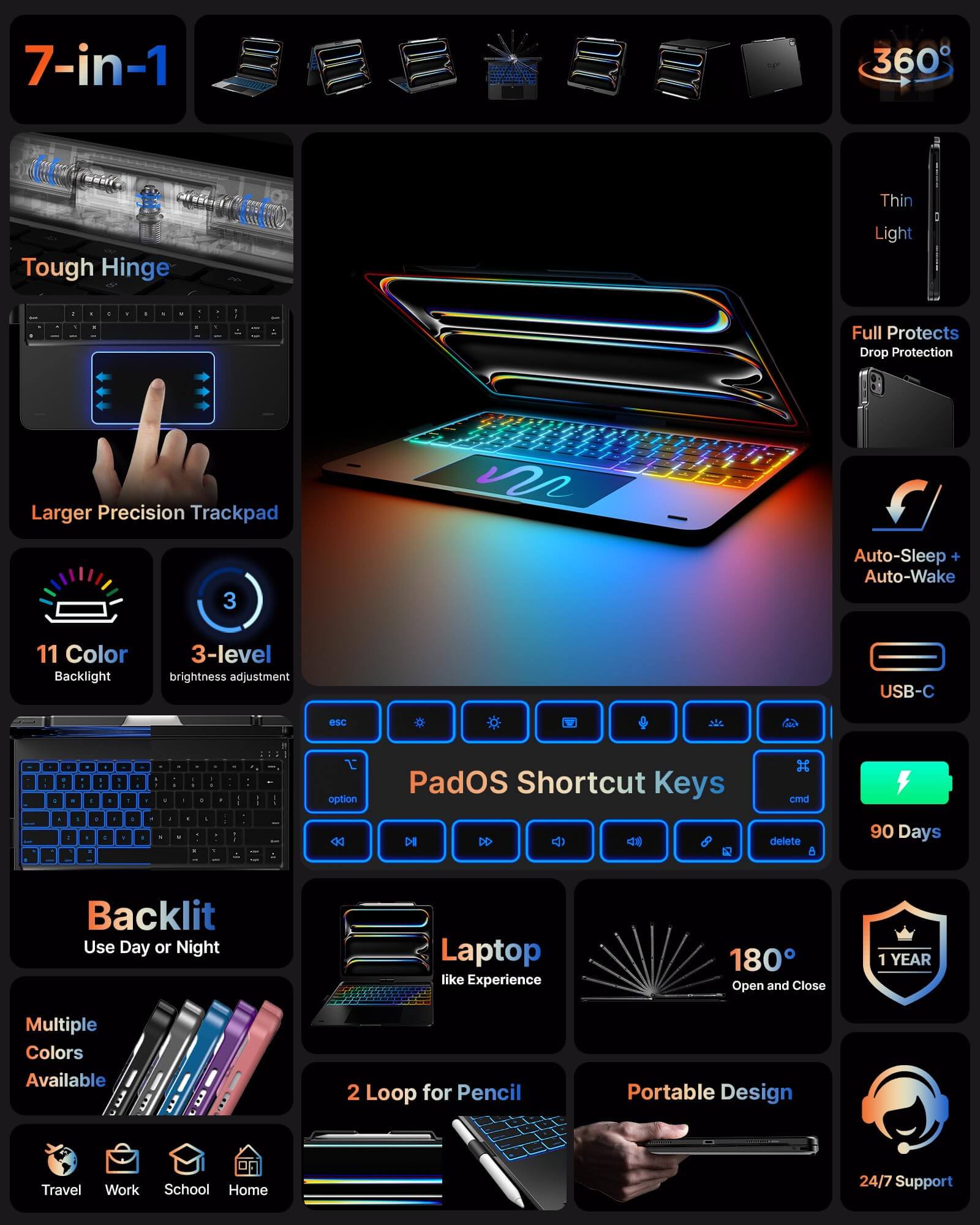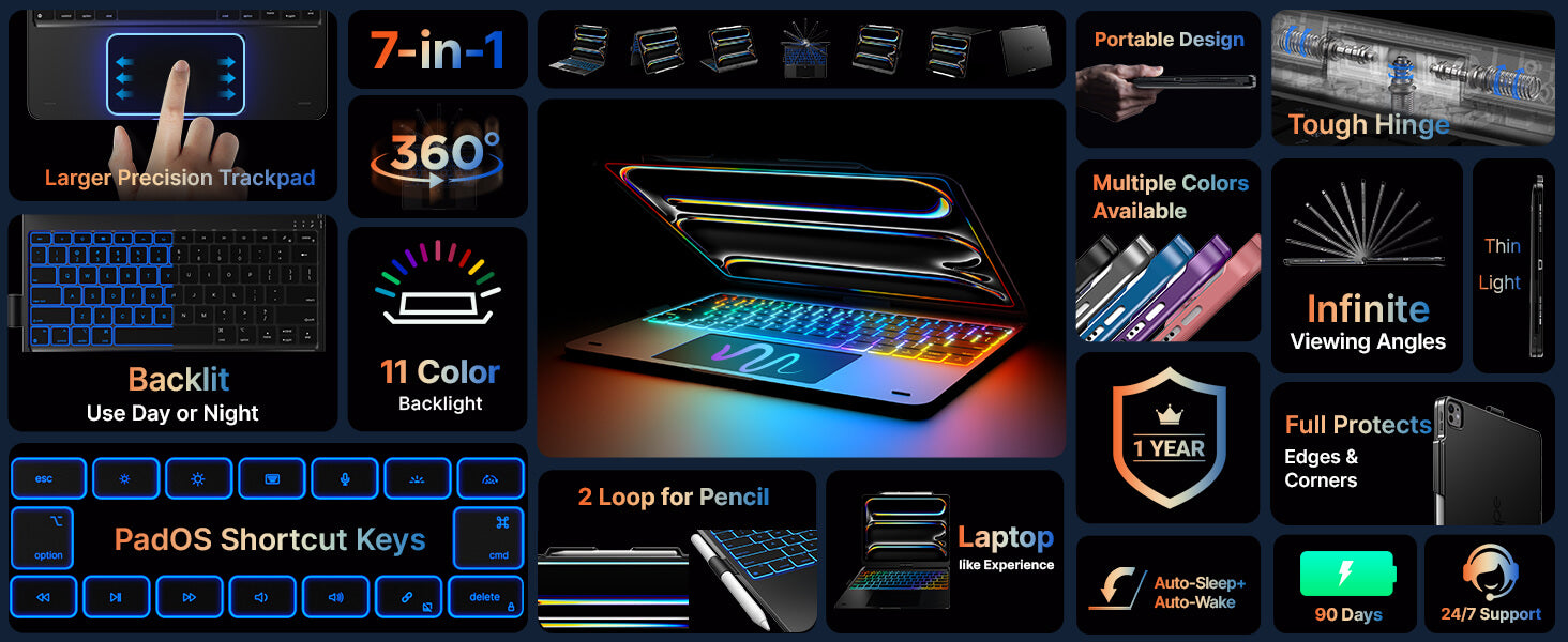 The 11-color RGB backlit keyboard with a full row of iPadOS shortcuts provides a comfortable typing experience, day or night