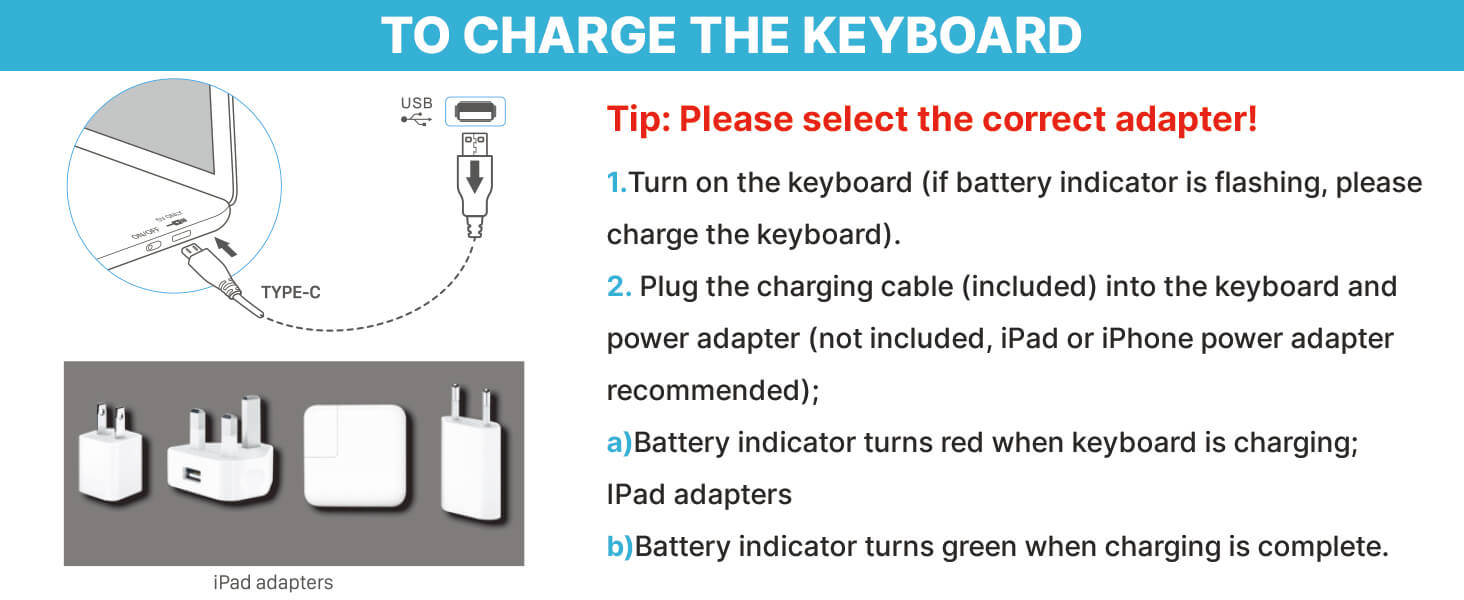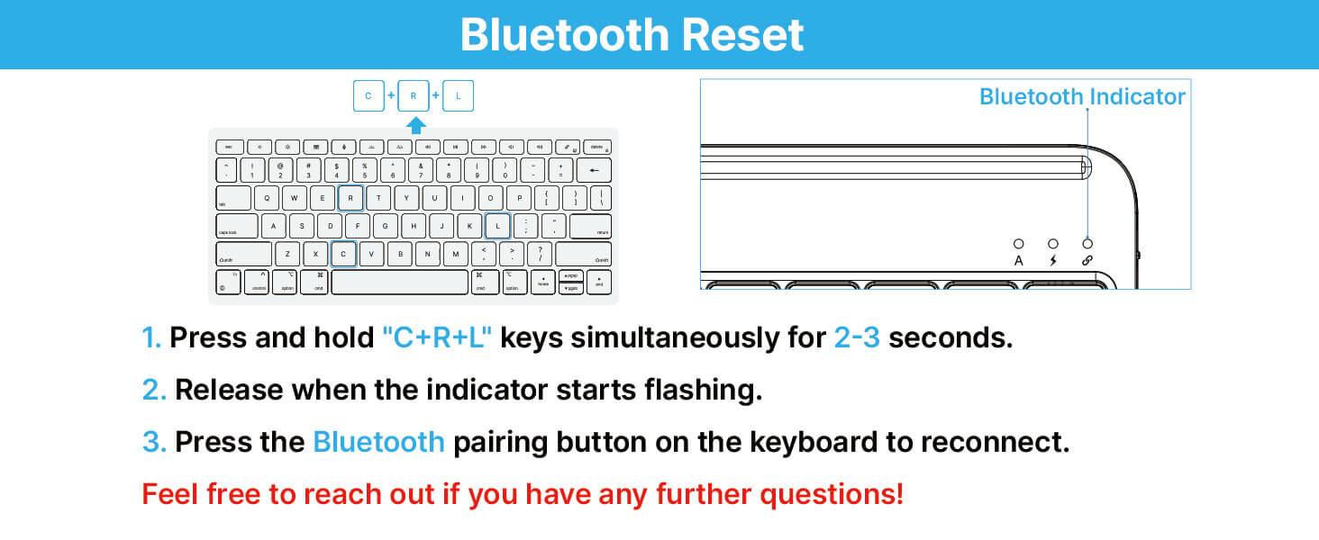 02. Press C+R+L for 2–3 seconds to reset the keyboard to factory settings. Release the keys once the indicator light flashes. Reconnect to iPad.