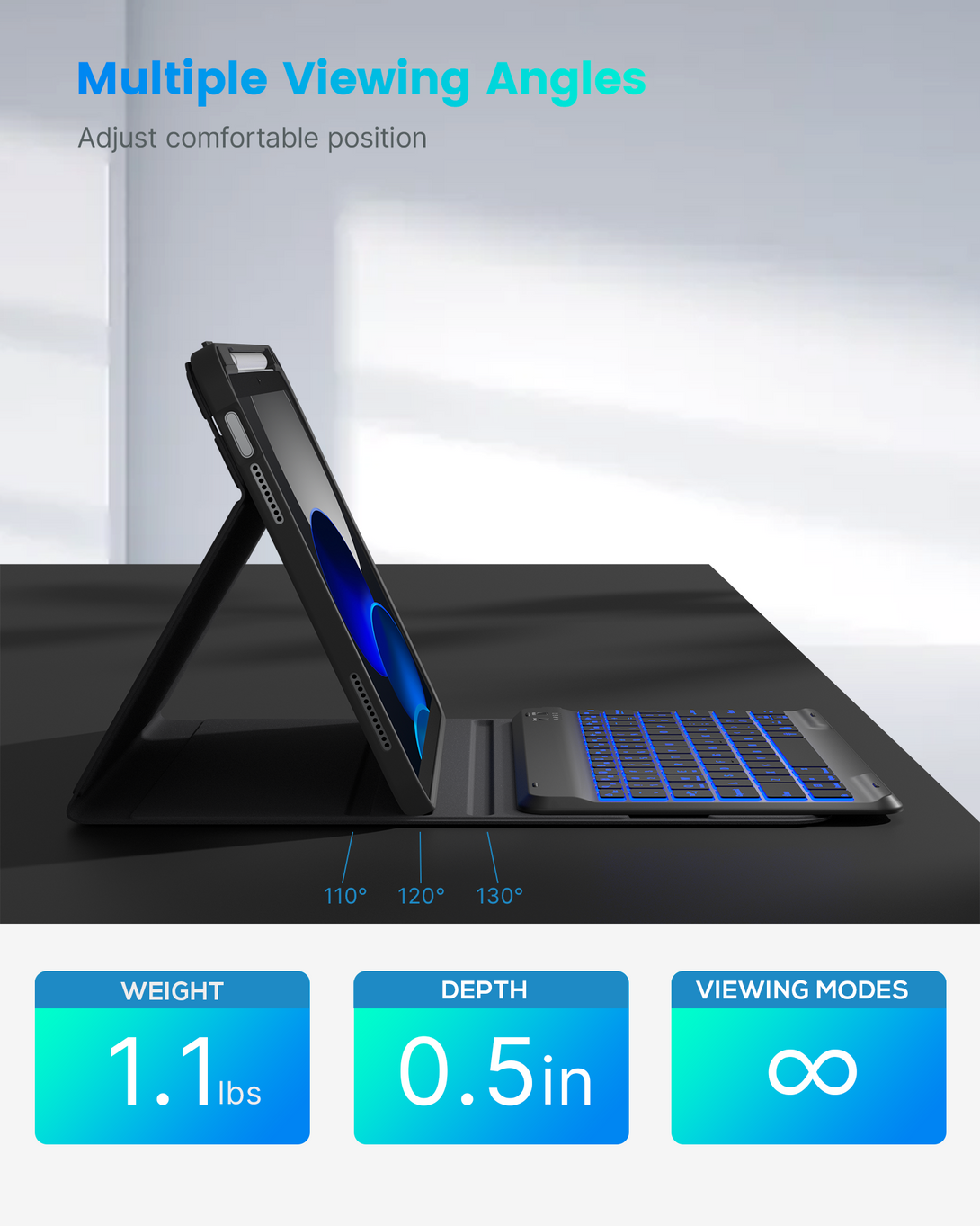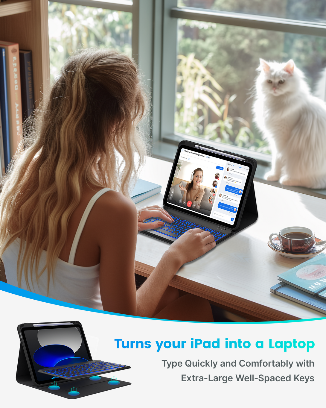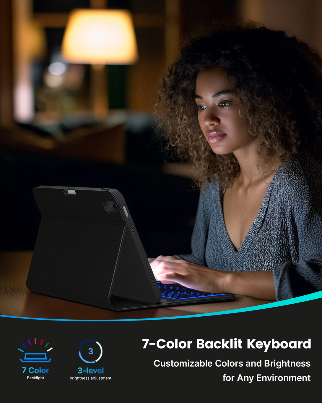 - Ilumina tu escritura: Mejora tu iPad con un teclado retroiluminado de 7 colores y teclas grabadas con láser. Perfecto para cualquier iluminación, desde el trabajo nocturno hasta cafeterías acogedoras. Disfruta de una escritura silenciosa y cómoda con la retroiluminación personalizable y las teclas ergonómicas de tijera.