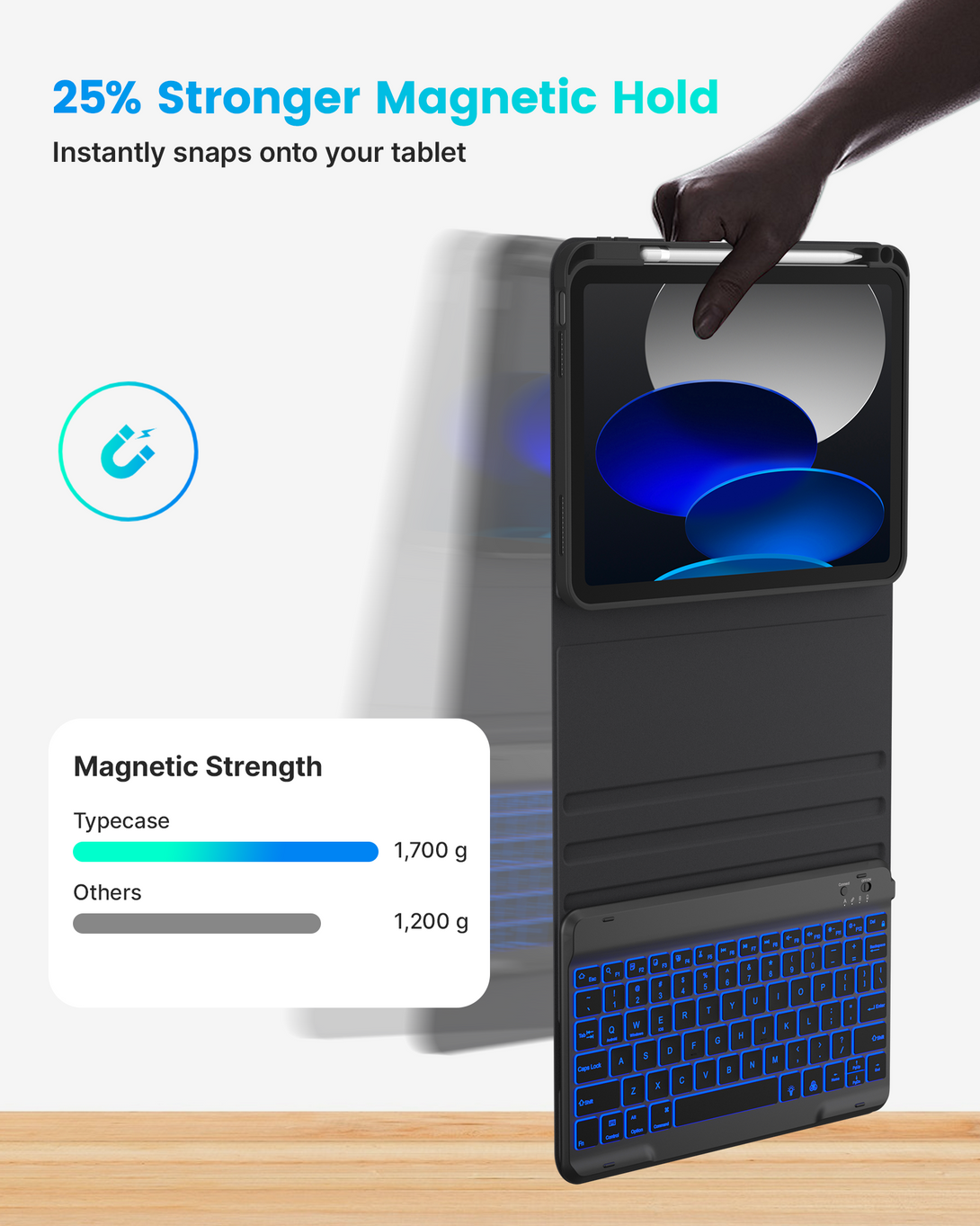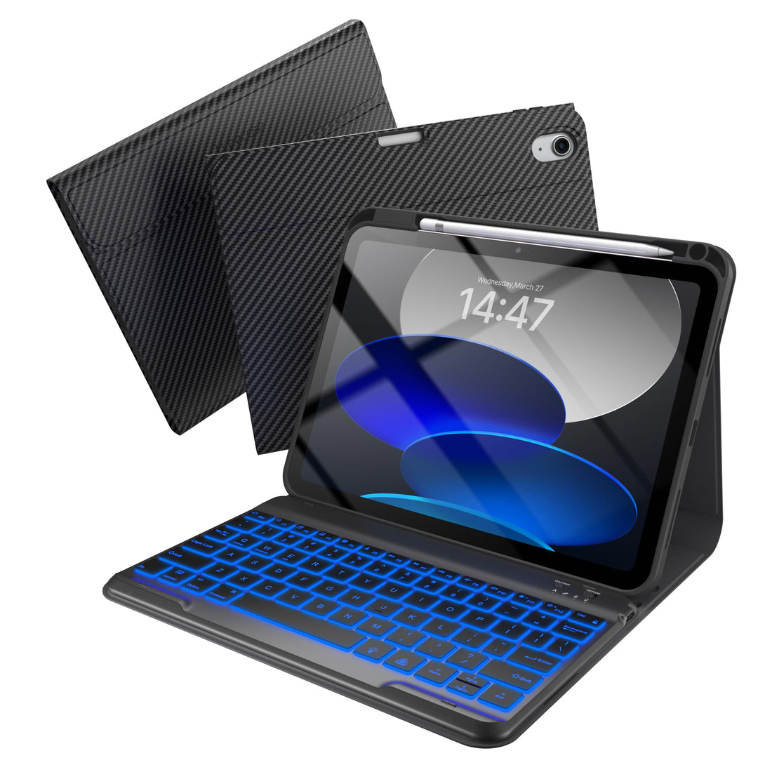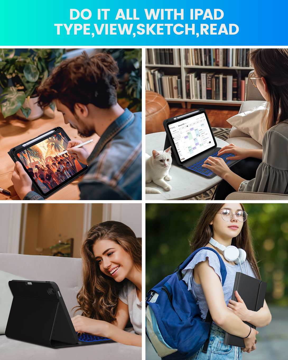 - Ilumina tu escritura: Mejora tu iPad con un teclado retroiluminado de 7 colores y teclas grabadas con láser. Perfecto para cualquier iluminación, desde el trabajo nocturno hasta cafeterías acogedoras. Disfruta de una escritura silenciosa y cómoda con la retroiluminación personalizable y las teclas ergonómicas de tijera.