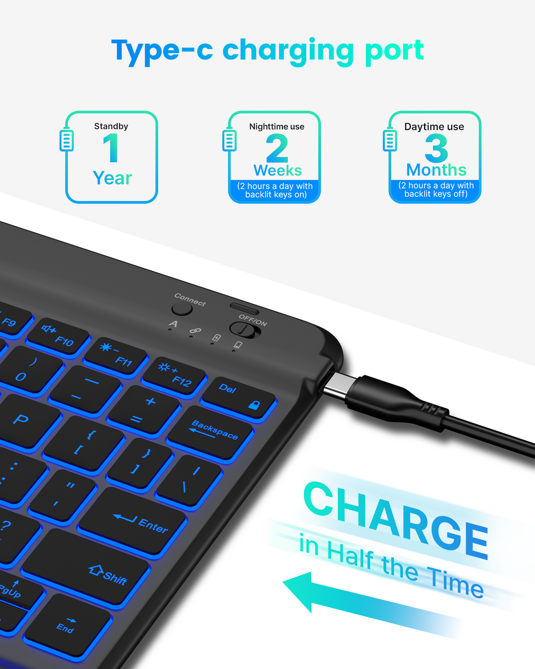 - Energía para tu iPad todo el día: Esta funda con teclado para iPad de 10.ª generación cuenta con una batería de 420 mAh que proporciona hasta 240 horas de uso con una sola carga. Perfecta para estudiar, trabajar y el día a día. Se recarga completamente en solo 2 horas con el cable tipo C incluido.