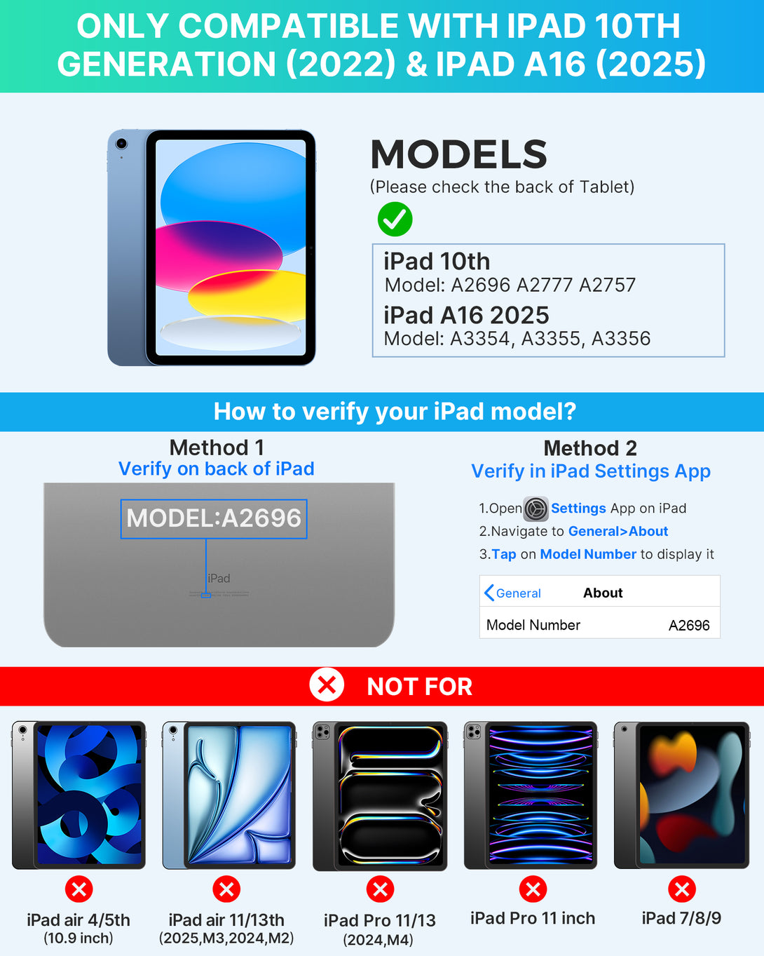 - Compatibilidad: Diseñado para el iPad de 10.ª generación de 2022 de 10,9 pulgadas (modelos: A2696/A2757/A2777). No compatible con otros modelos de iPad; comprueba el número de modelo en la parte trasera de tu iPad para asegurar un ajuste perfecto.
