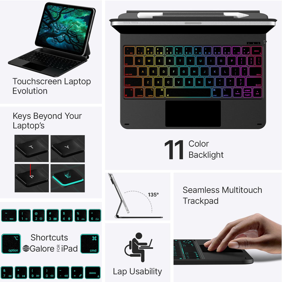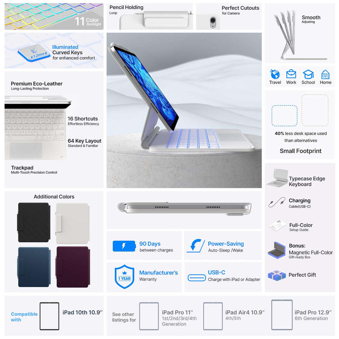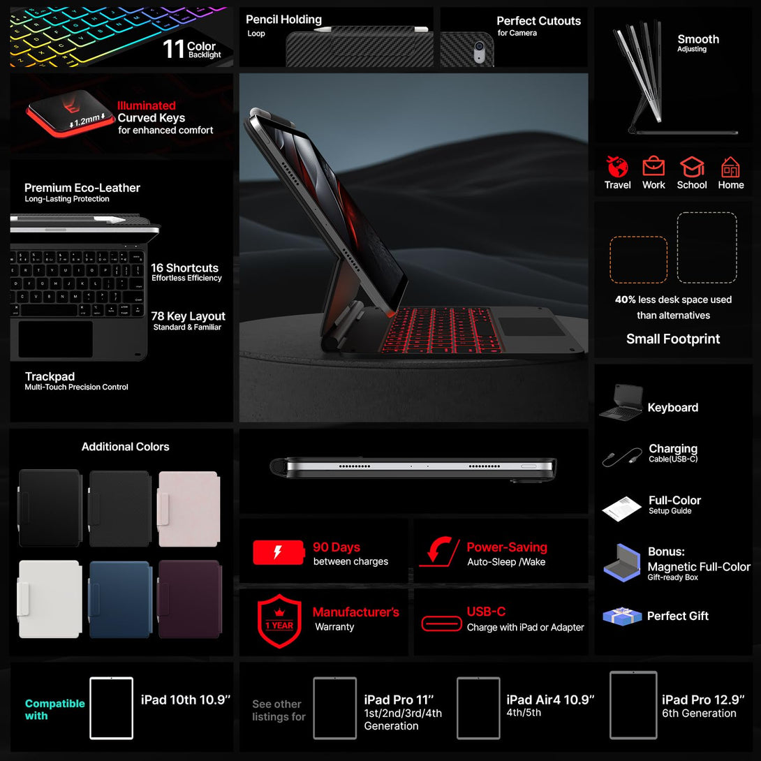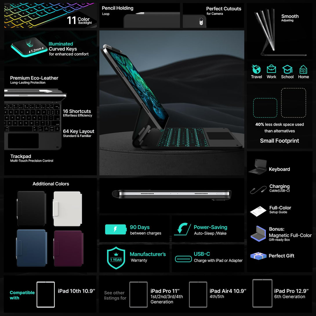 - 10-Color Backlight Keyboard with Shortcuts - Fluidly and accurately typing on the lighted keyboard for iPad 10th generation even in a dark room, ergonomic keys, 10 colors of backlight, and three adjustable backlight brightness levels give you a comfortable typing experience. No more searching around for basic functions, be more efficient with a full row of PadOS shortcuts to adjust brightness levels, change backlit colors, media, volume control, and more.