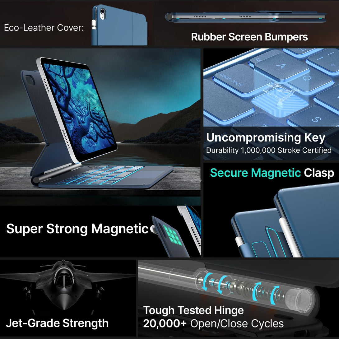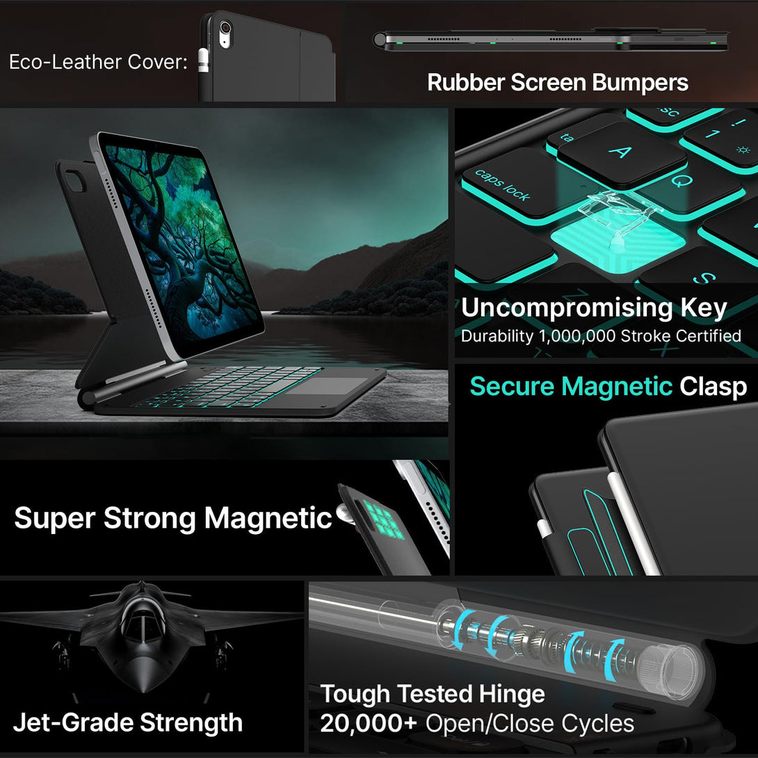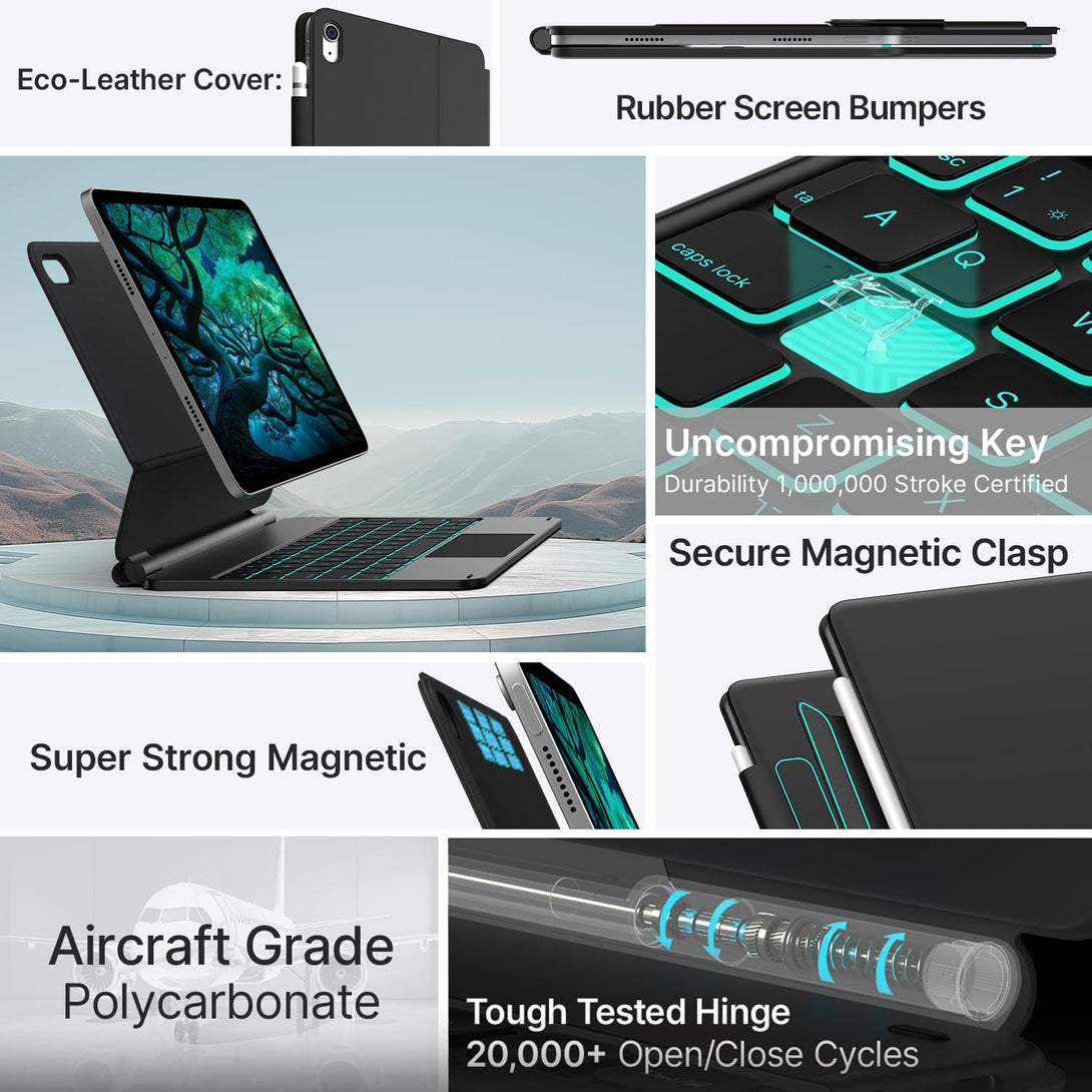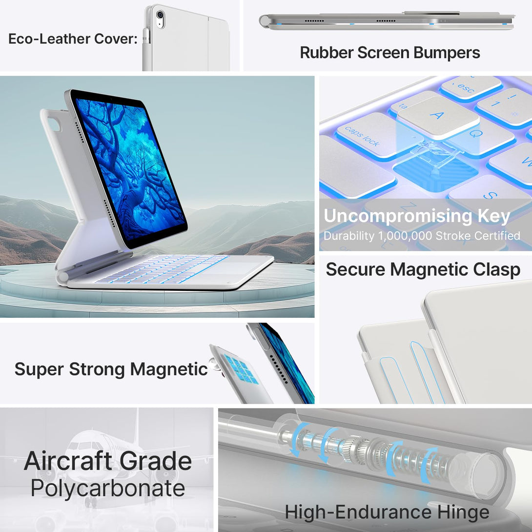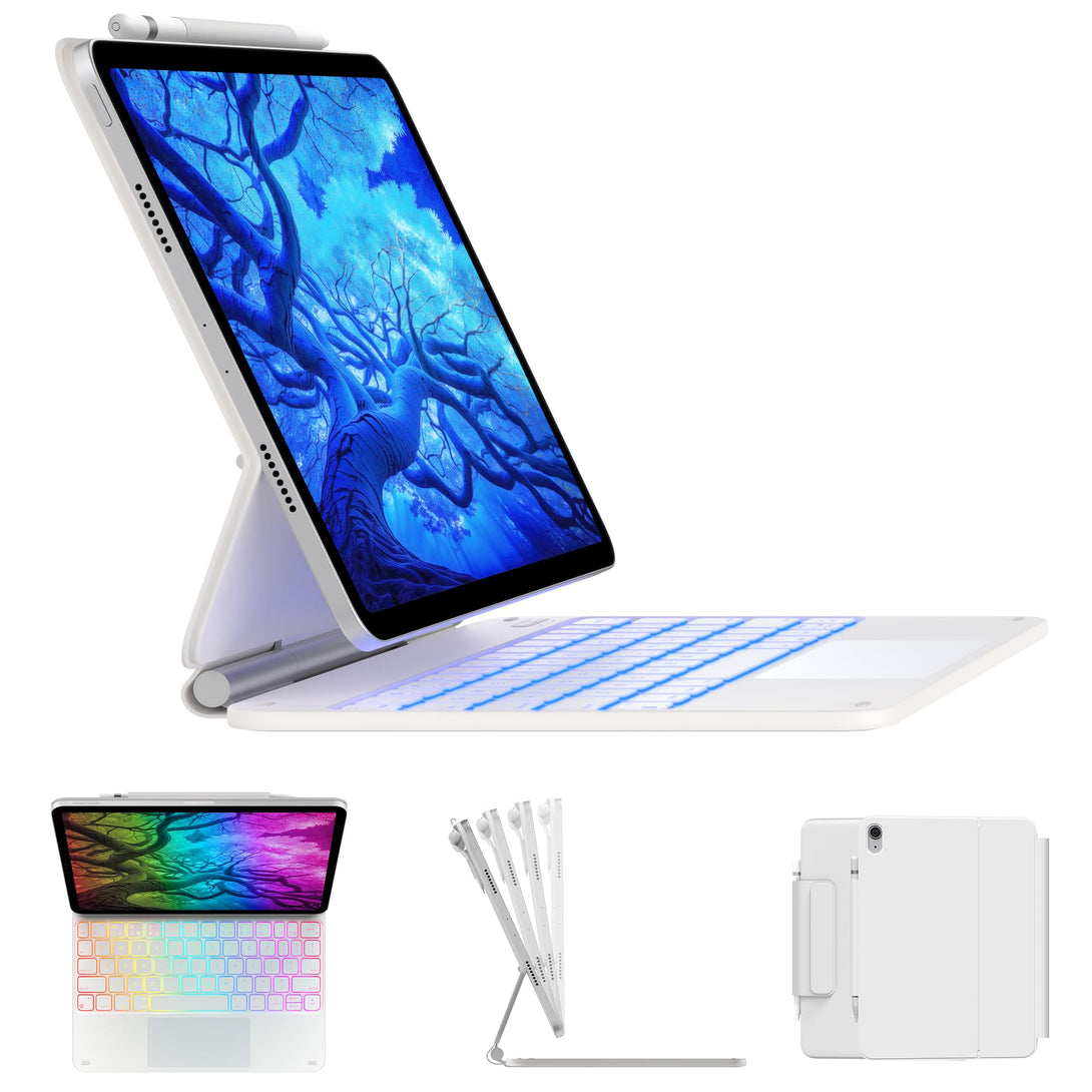 - 10-Color Backlight Keyboard with Shortcuts - Fluidly and accurately typing on the lighted keyboard for iPad 10th generation even in a dark room, ergonomic keys, 10 colors of backlight, and three adjustable backlight brightness levels give you a comfortable typing experience. No more searching around for basic functions, be more efficient with a full row of PadOS shortcuts to adjust brightness levels, change backlit colors, media, volume control, and more.