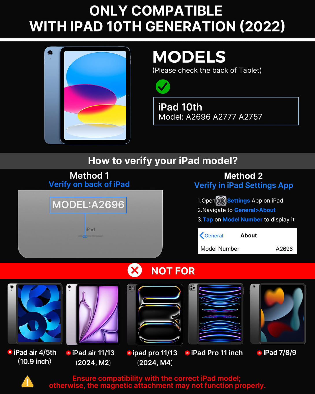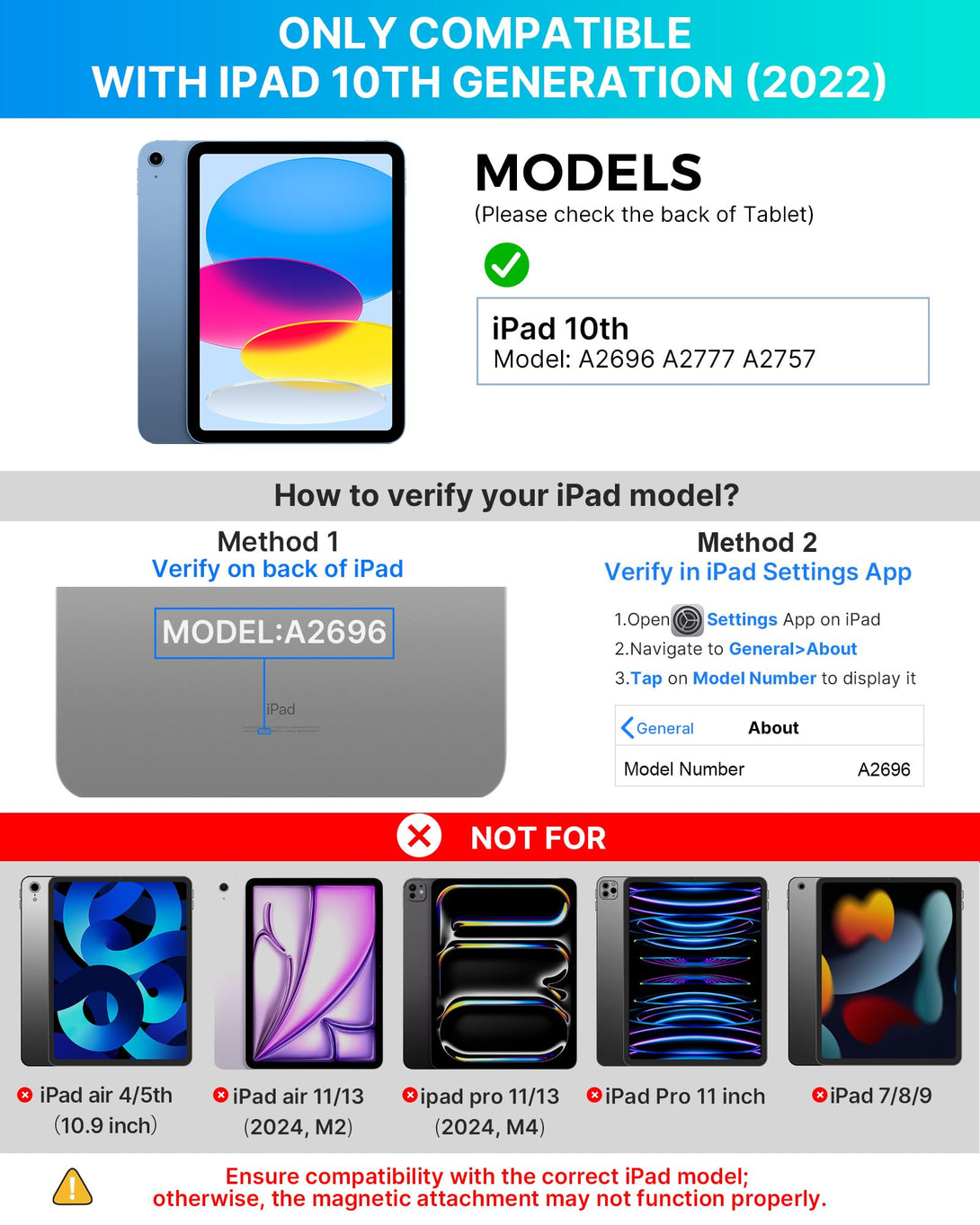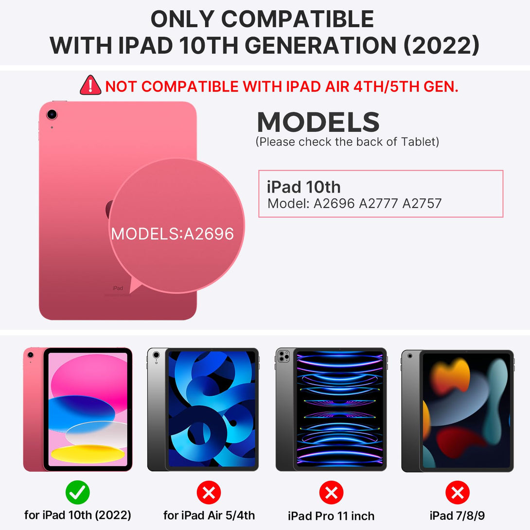 - Compatibility: This keyboard case, designed specifically for 10th-generation iPad models (10.9-inch, 2022) A2696, A2757, A2777, ensures a perfect fit by checking your iPad's model number on the back, starting with 'A.'