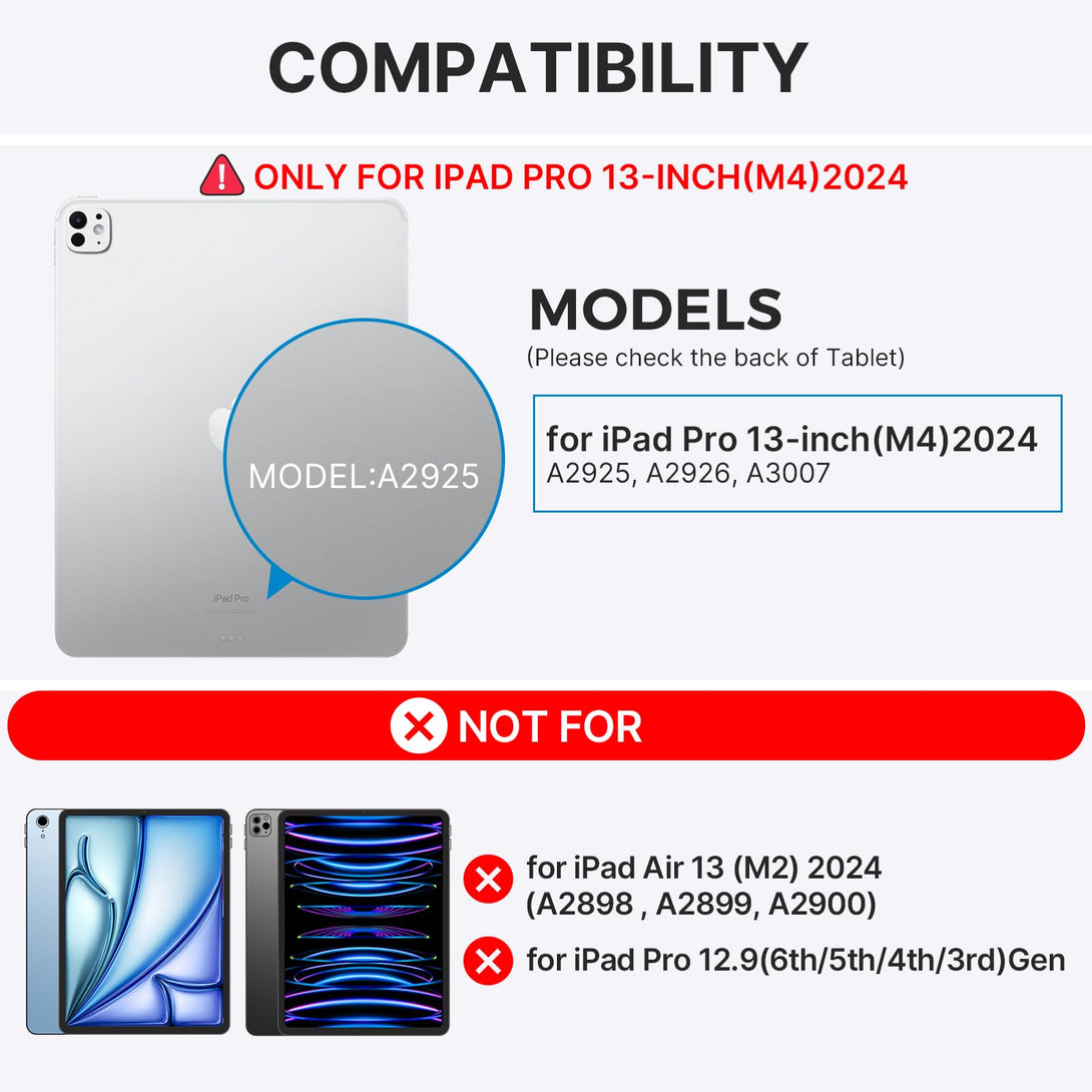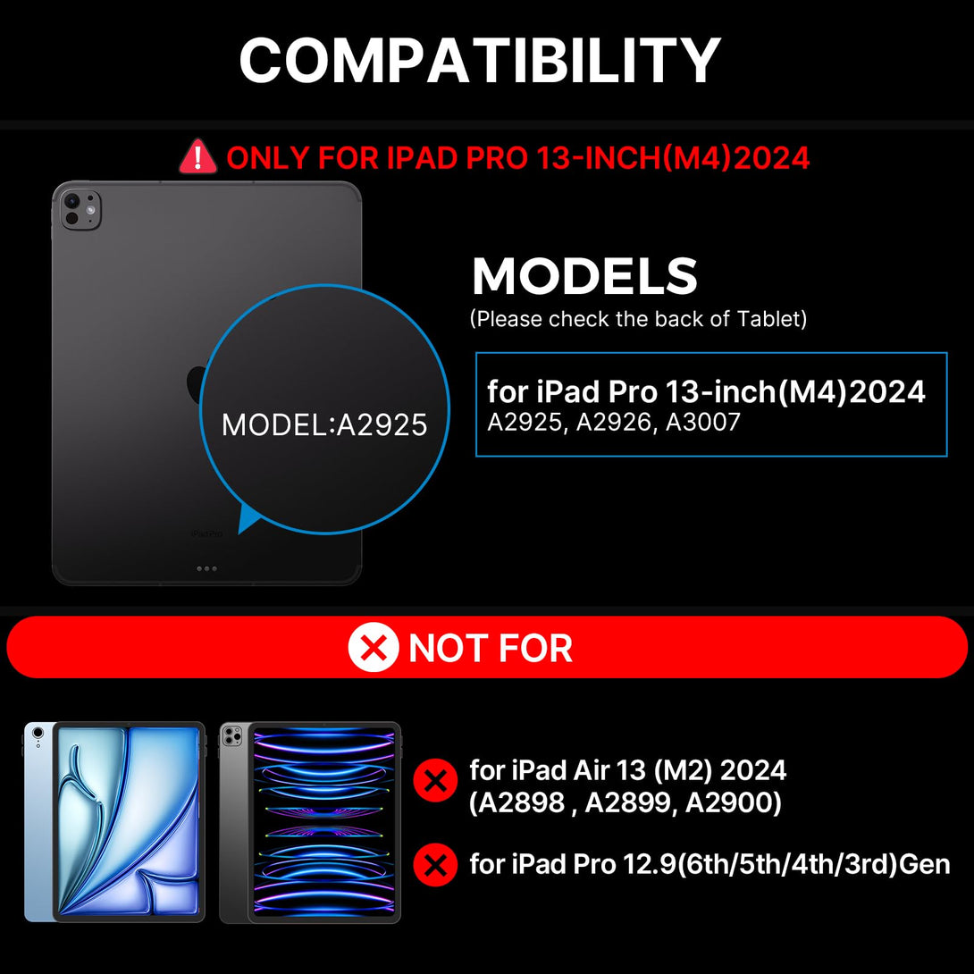 ๐๐ผ๐บ๐ฝ๐ฎ๐๐ถ๐ฏ๐ถ๐น๐ถ๐๐: Elevate your iPad Pro 13 inch (M4) 2024 experience with our versatile keyboard case. models include 2024 iPad Pro 13 inch(A2925,A2926,A3007);NOTE:NOT FIT FOR IPAD AIR 13(M2) 2024,Weโre happy to help! Reach out to us if you need to check compatibility.