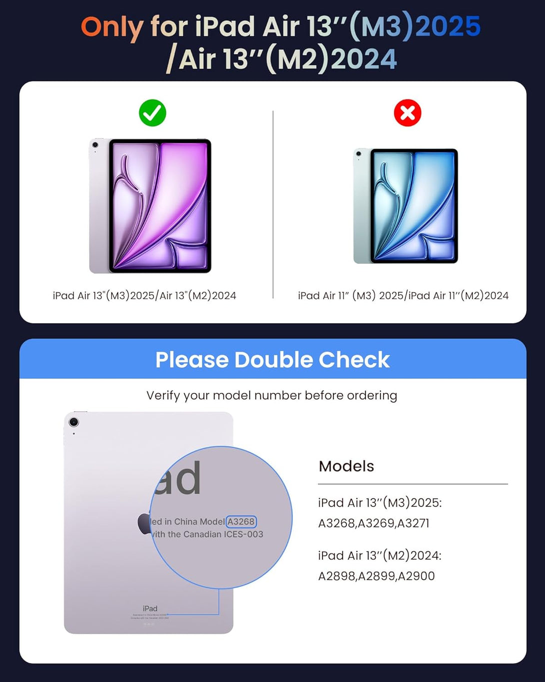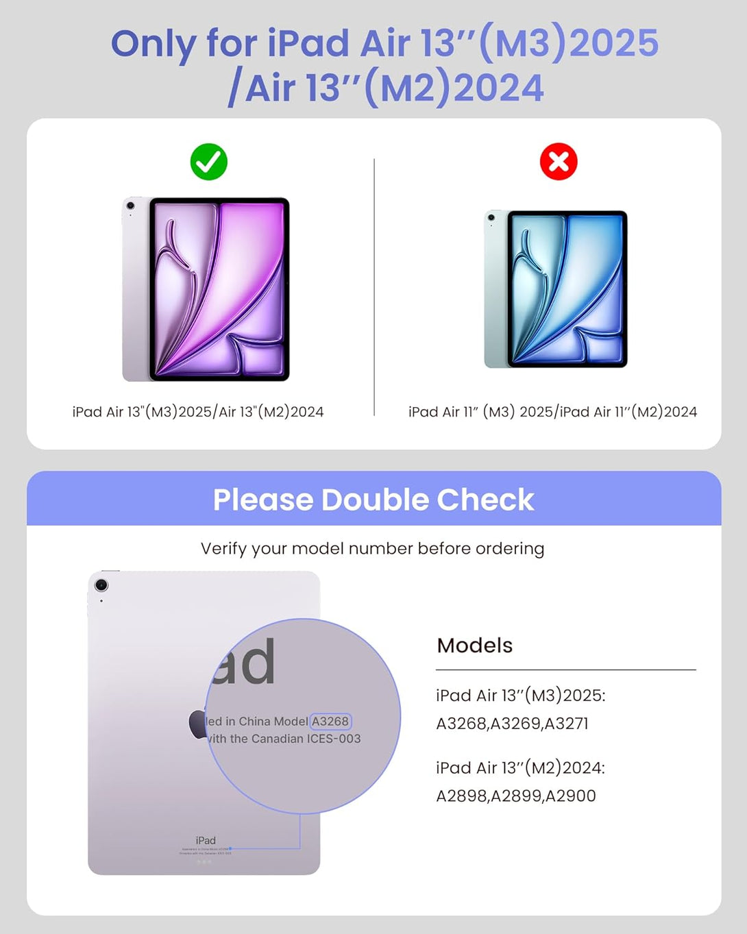 𝐏𝐞𝐫𝐟𝐞𝐜𝐭 𝐅𝐢𝐭 – 𝐢𝐏𝐚𝐝 𝐀𝐢𝐫 𝟏𝟑-𝐢𝐧𝐜𝐡 (𝟐𝟎𝟐𝟒): Exclusive for models A3268, A3269, A3271—unique magnetic arrangement; other iPads cannot attach. If you're unsure about compatibility, Feel free to reach out—we're happy to help!