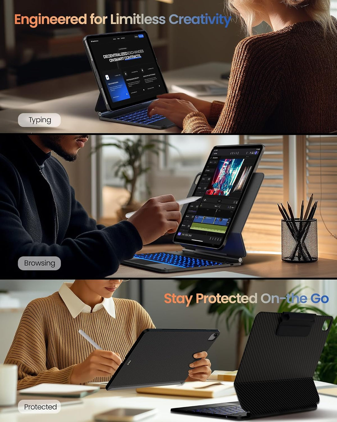 𝐖𝐨𝐫𝐤 𝐀𝐧𝐲𝐰𝐡𝐞𝐫𝐞 – 𝐒𝐧𝐚𝐩 & 𝐆𝐨: Magnetic attachment in seconds turns your iPad into a portable workstation—perfect for coffee shops, flights, or home use.
