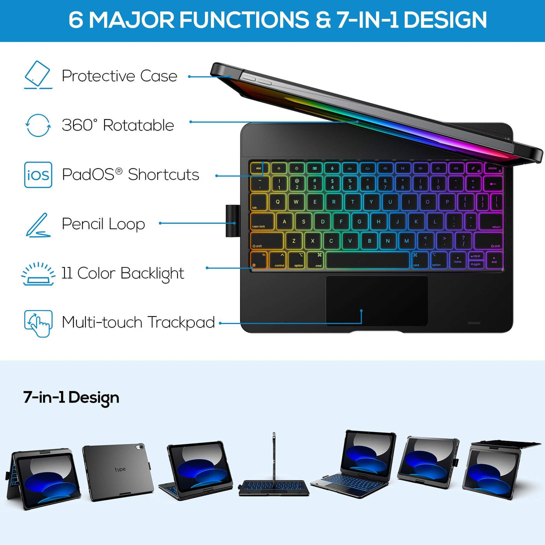Type quickly and accurately on a laptop-like keyboard with a full row of iPadOS shortcuts and laser-etched keys that allow an adjustable 10-color RGB LED backlight to shine through.