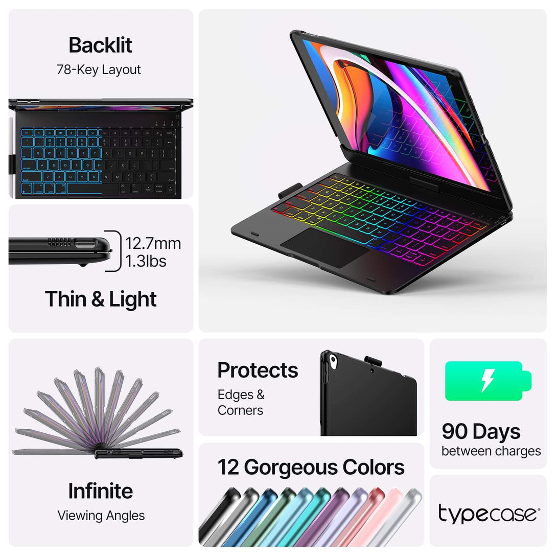 The 11-color RGB backlit keyboard with a full row of iPadOS shortcuts provides a comfortable typing experience, day or night