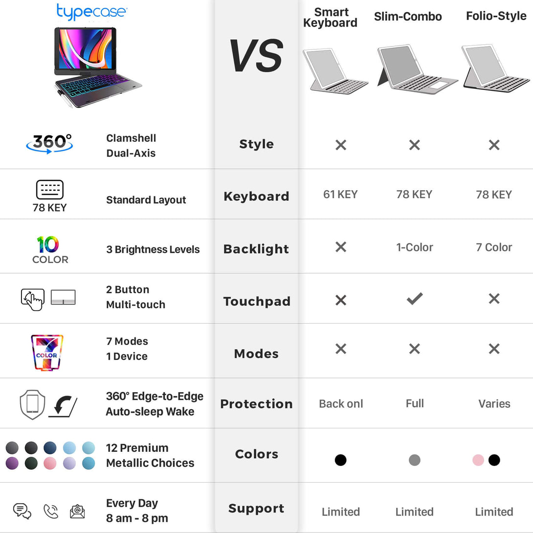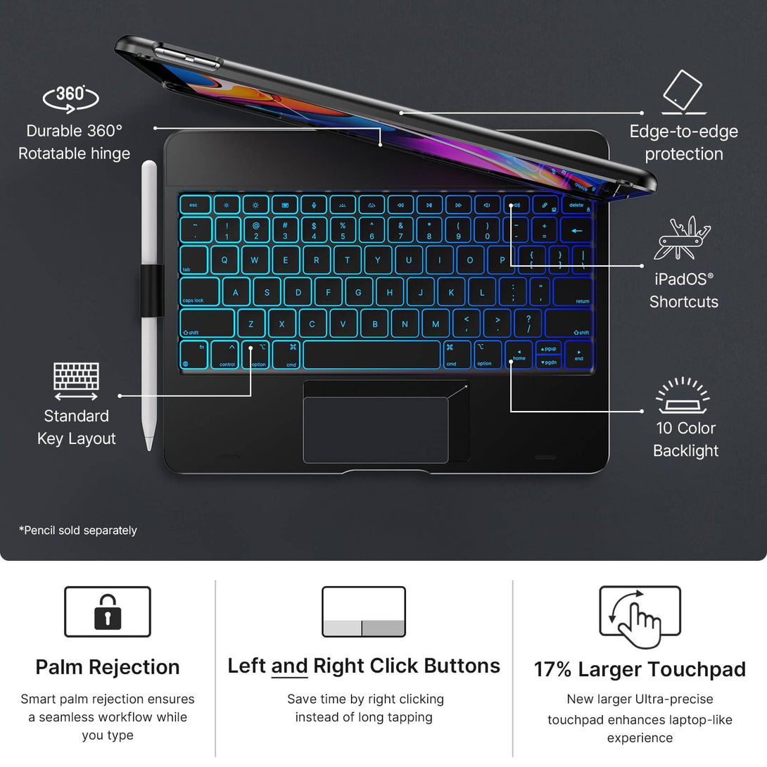 Premium hard-shell design protects all sides of your iPad; auto sleep/wake initiates when keyboard case is opened & closed to conserve battery life; holder for Apple Pencil so it won't get lost or in the way.