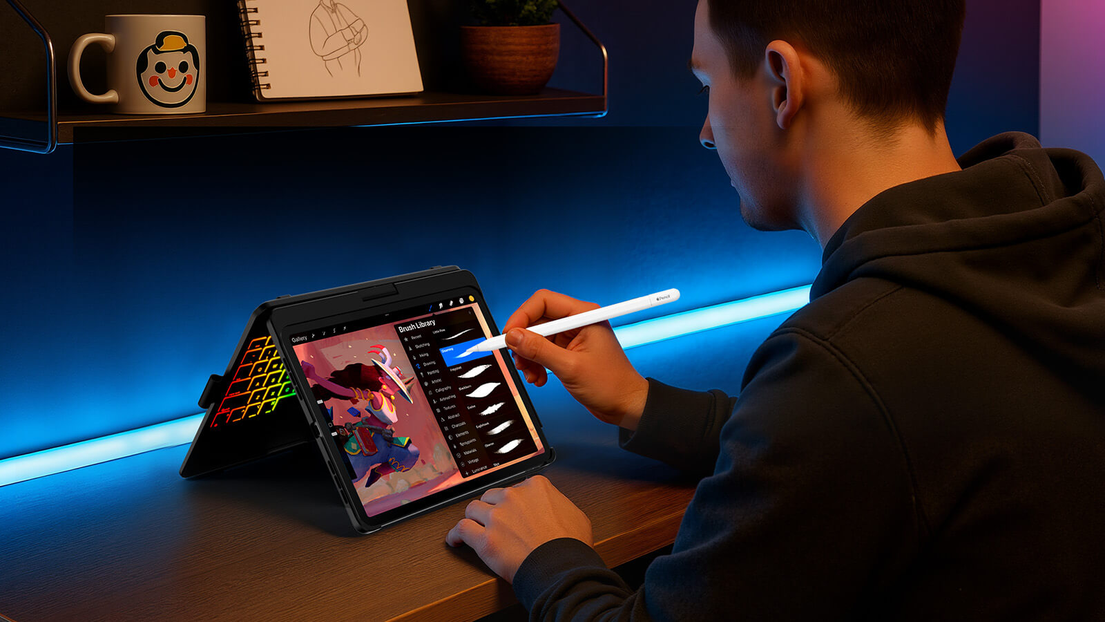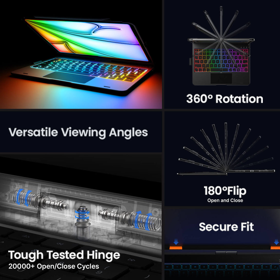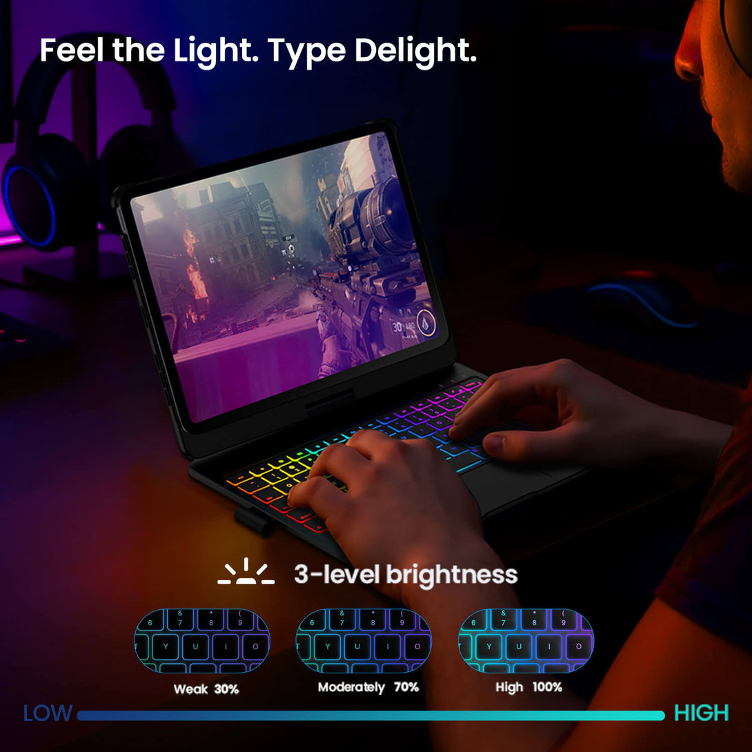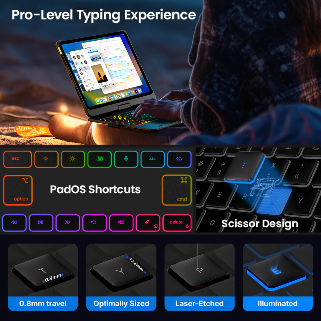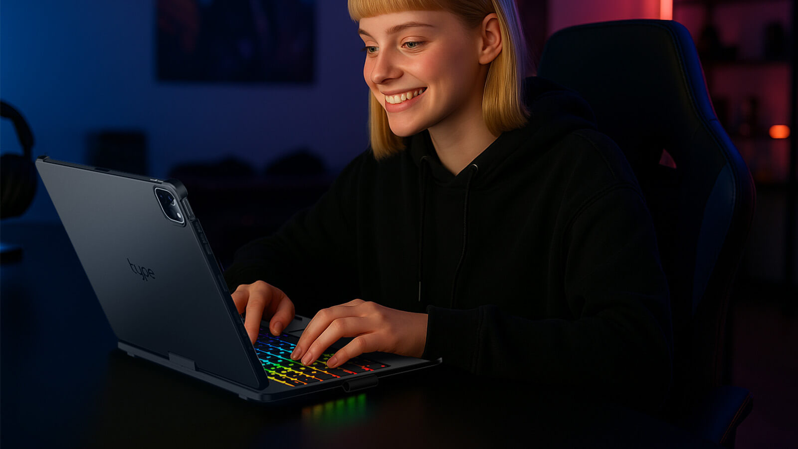 The 11-color RGB backlit keyboard with a full row of iPadOS shortcuts provides a comfortable typing experience, day or night