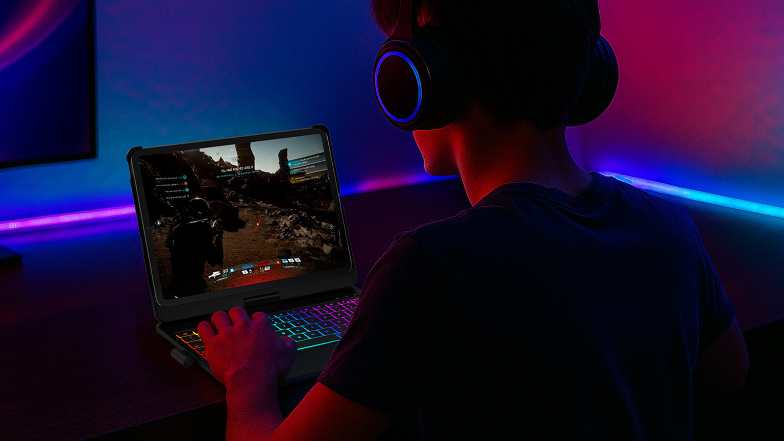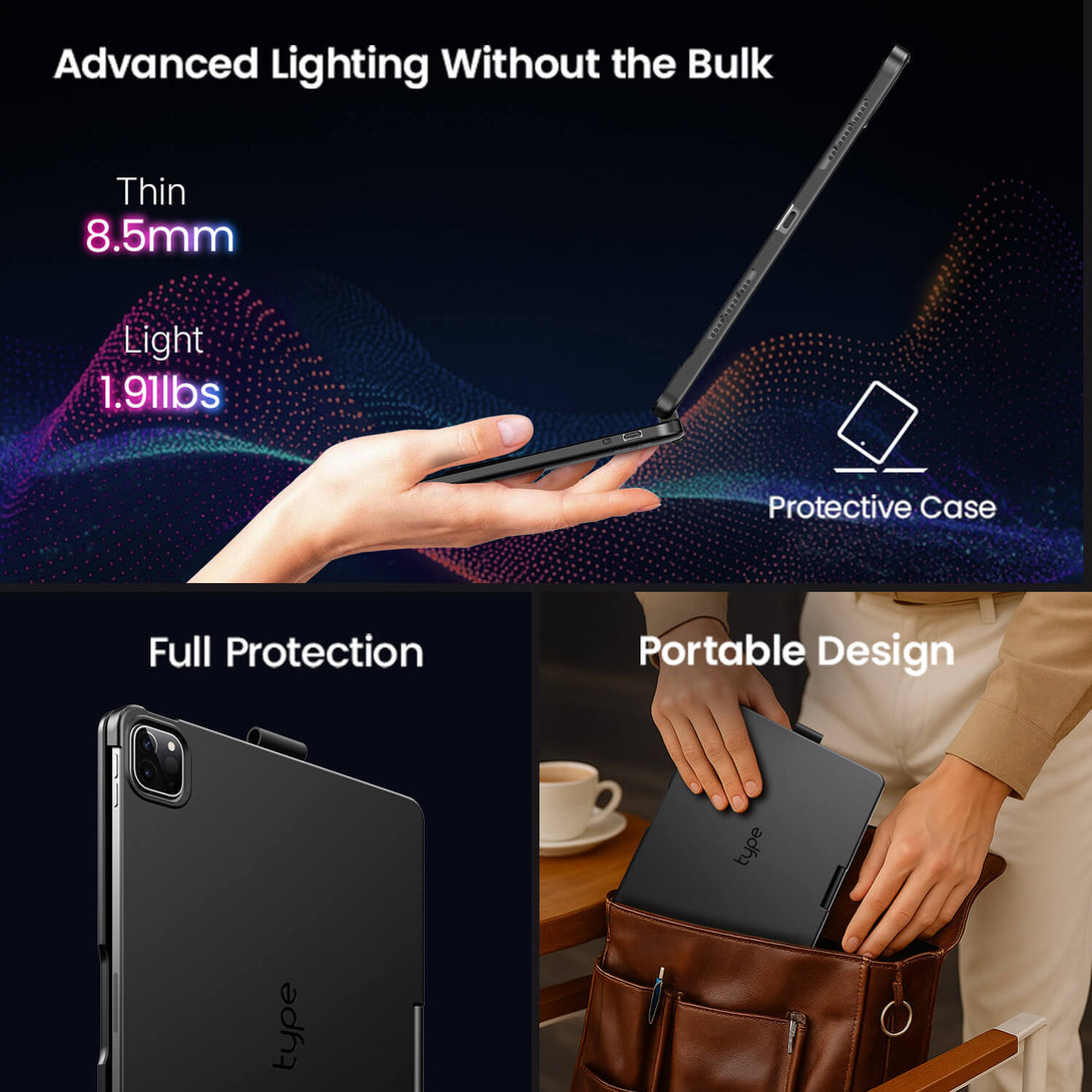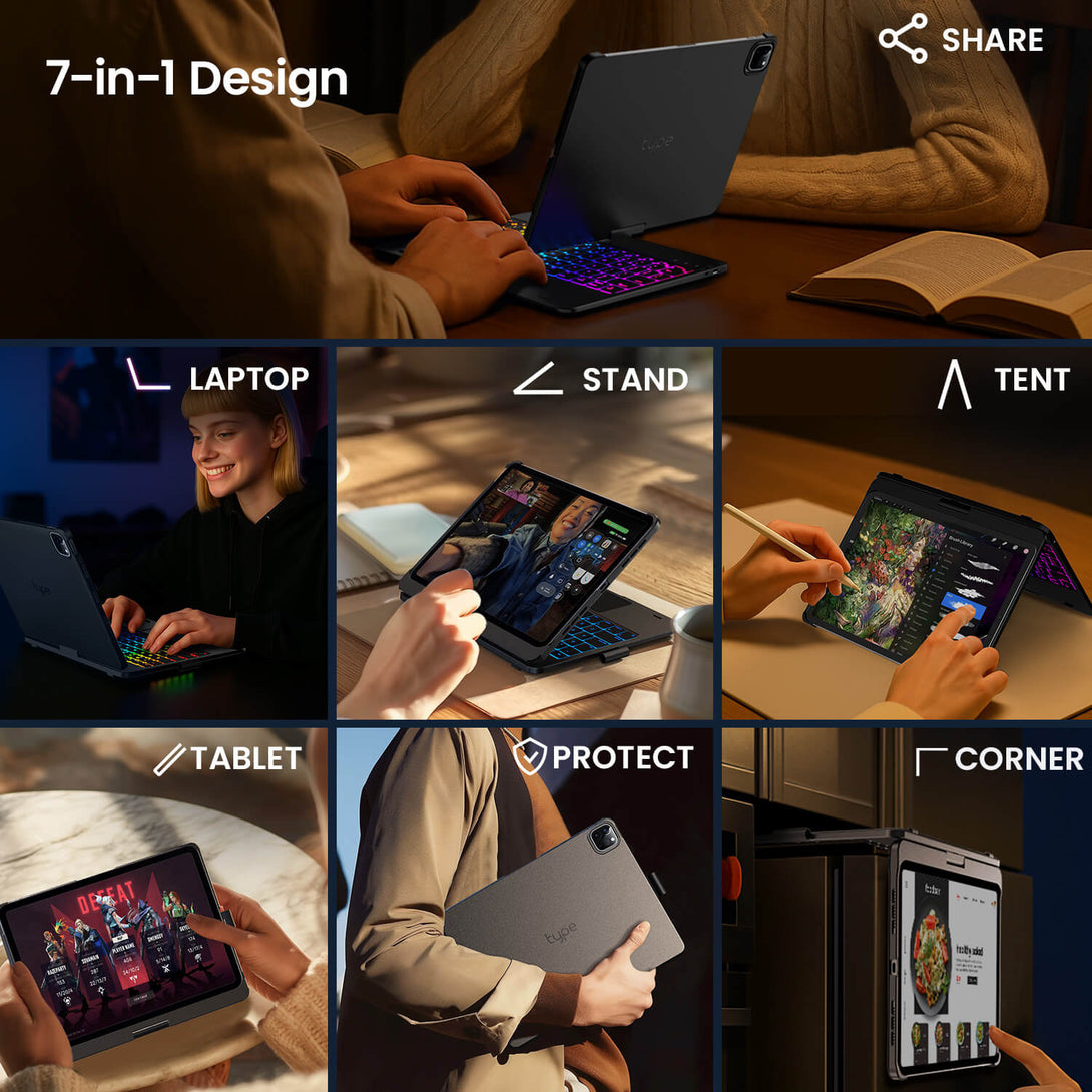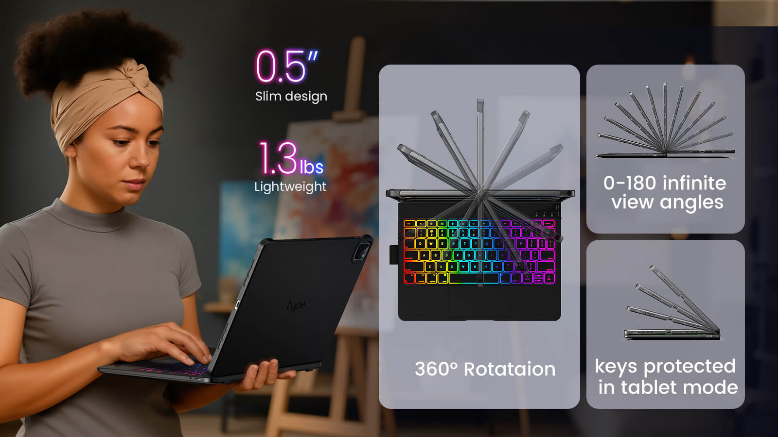 The 11-color RGB backlit keyboard with a full row of iPadOS shortcuts provides a comfortable typing experience, day or night