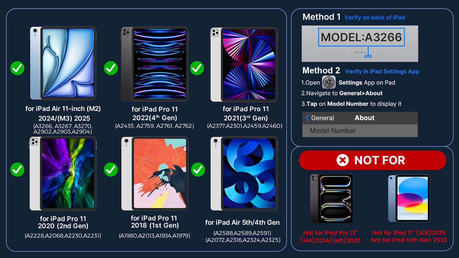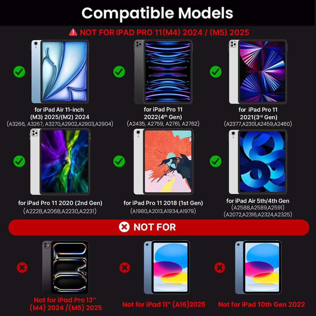 Only fits: iPad Air 11 in (M3 2025 / M2 2024) & iPad Pro 11 in 4th/3rd/2nd/1st gen & iPad Air 5th/4th gen.
