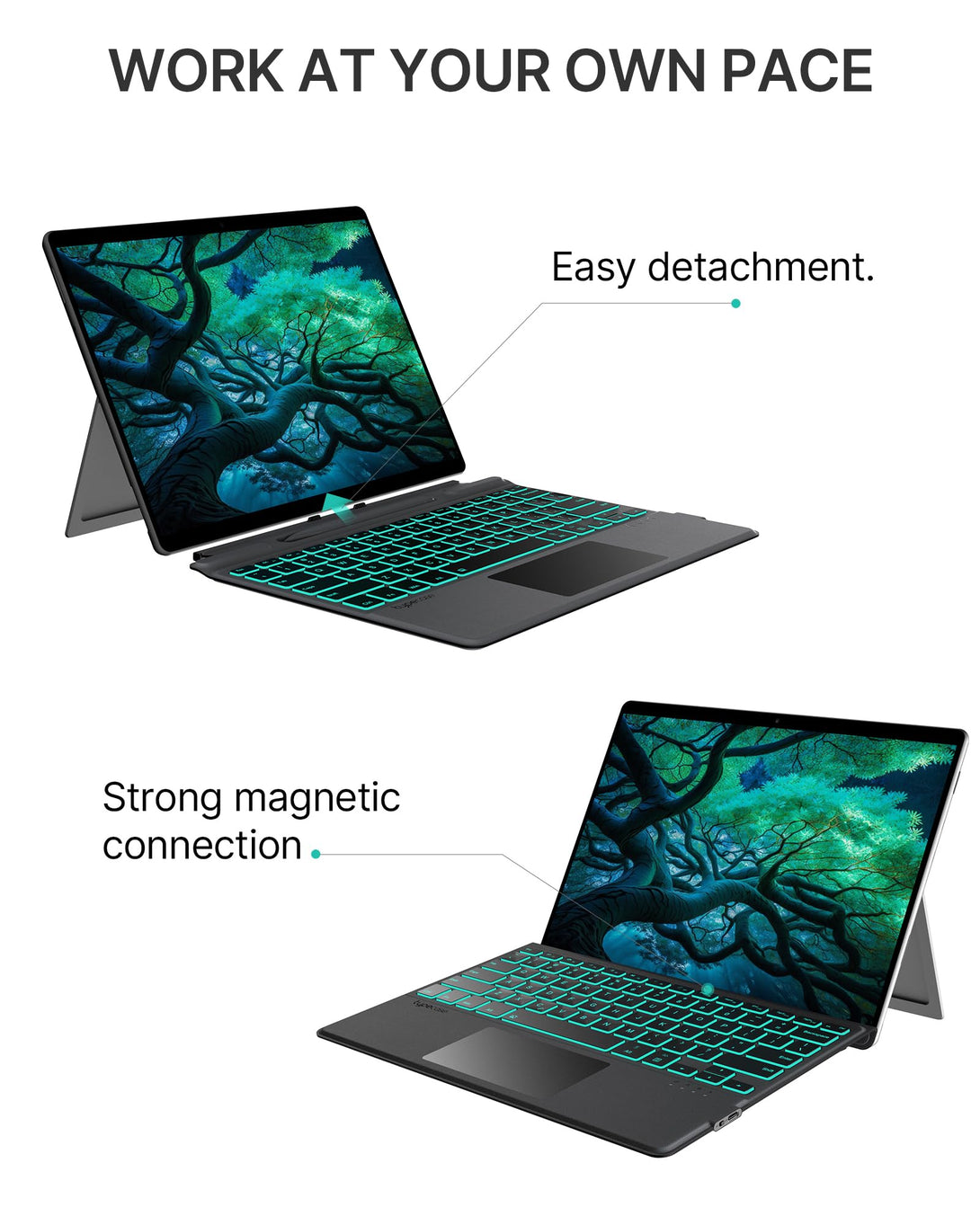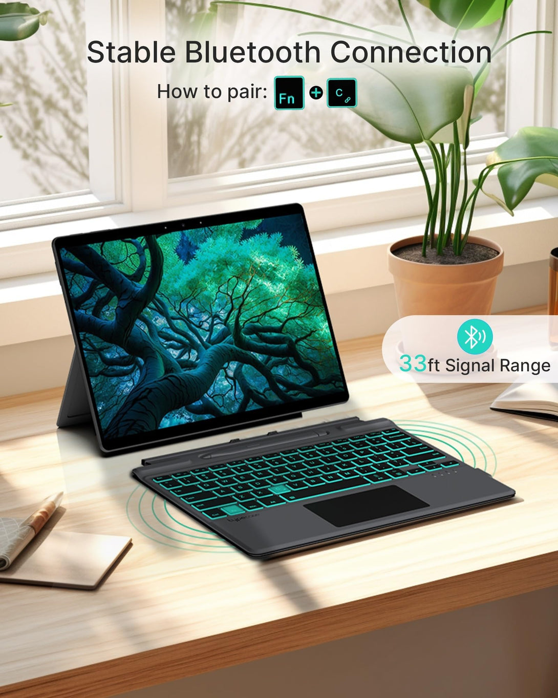 - Magnetic Detachable Keyboard with Wireless Connection - A powerful magnetic attachment strip and nonslip back hold your Surface Pro 8 / Surface Pro X tablet securely in place. The type cover connects wirelessly to your Surface Pro 9 via Bluetooth, ensuring a stable and reliable connection. The operating distance is up to 10 meters (33ft). Press the Fn+C keys for 2-3 seconds to enter the pairing state; Enjoy the ultimate freedom and flexibility in your work and play.