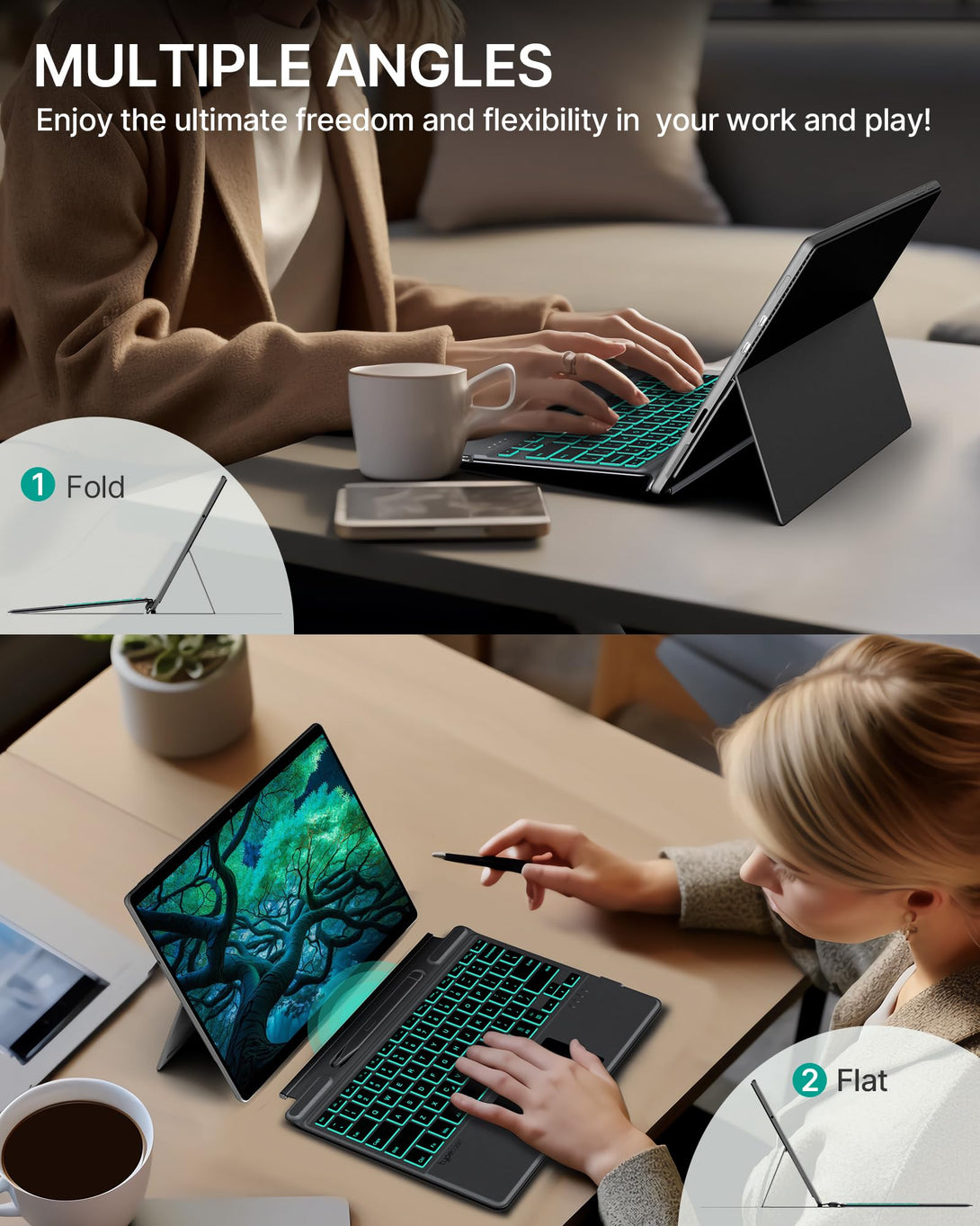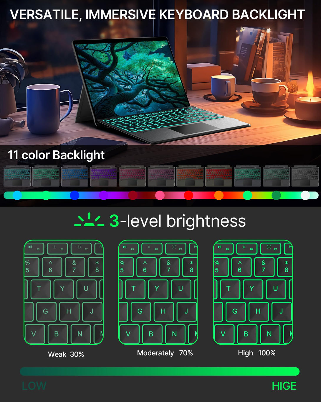 - 11 Colors LED Backlit with Shortcuts - This Surface Pro 9 keyboard features 11 elegant LED backlighting options and 3 brightness levels, providing better visibility, comfort, and personalization in low-light or dimly lit environments. Keyboard shortcuts allow you to quickly execute a command or function by pressing a combination of keys on your keyboard. With the Typecase type cover, you get a faster and more efficient way of performing common tasks or actions.