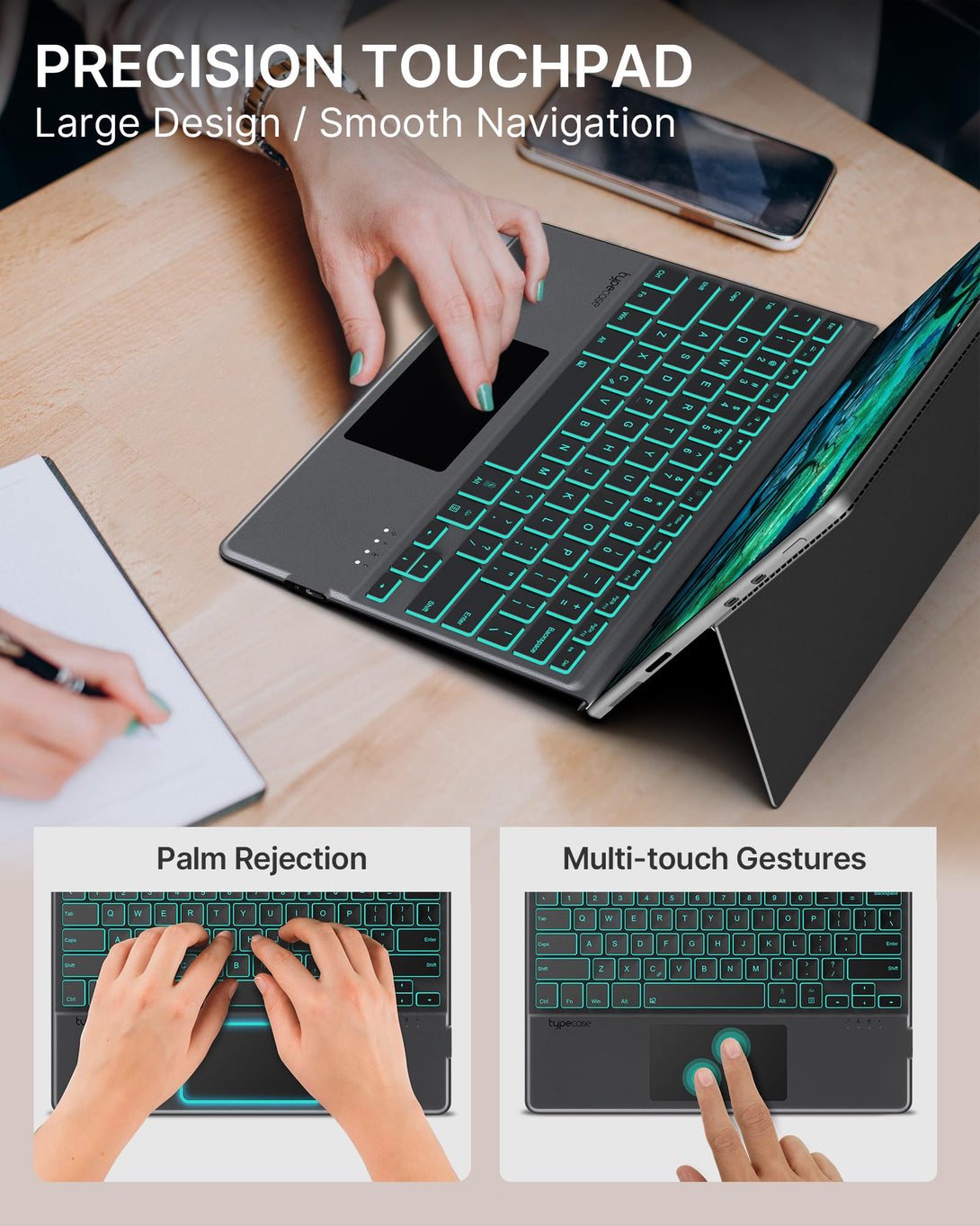 - Palm Rejection & Multi-touch Precision Trackpad - Upgraded with a large trackpad featuring palm rejection design, the touchpad auto-locks while typing but can be awakened with a one-finger click. With a precision touchpad, you can perform multi-touch gestures such as pinch-to-zoom, swipe, and tap-to-click, providing a smoother and faster way to interact with your Surface Pro 9 / Surface Pro 8 / Surface Pro X keyboard case.